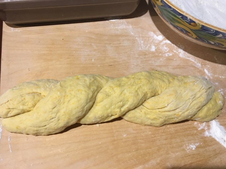 Twist the rolls together and place them in a 30 cm long, buttered and floured baking tin. Place to rise again in a warm place for 20 minutes.