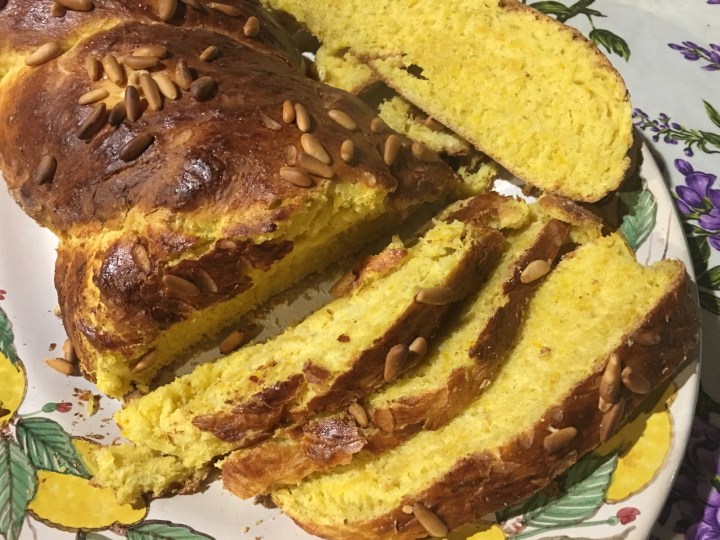 To prepare the festive table it is nice to offer the colours of Autumn and the pumpkin is a perfect color. A braided bread has the ideal appearance to be served with savory as ham and salami but also with sweet flavours like a good homemade jam.