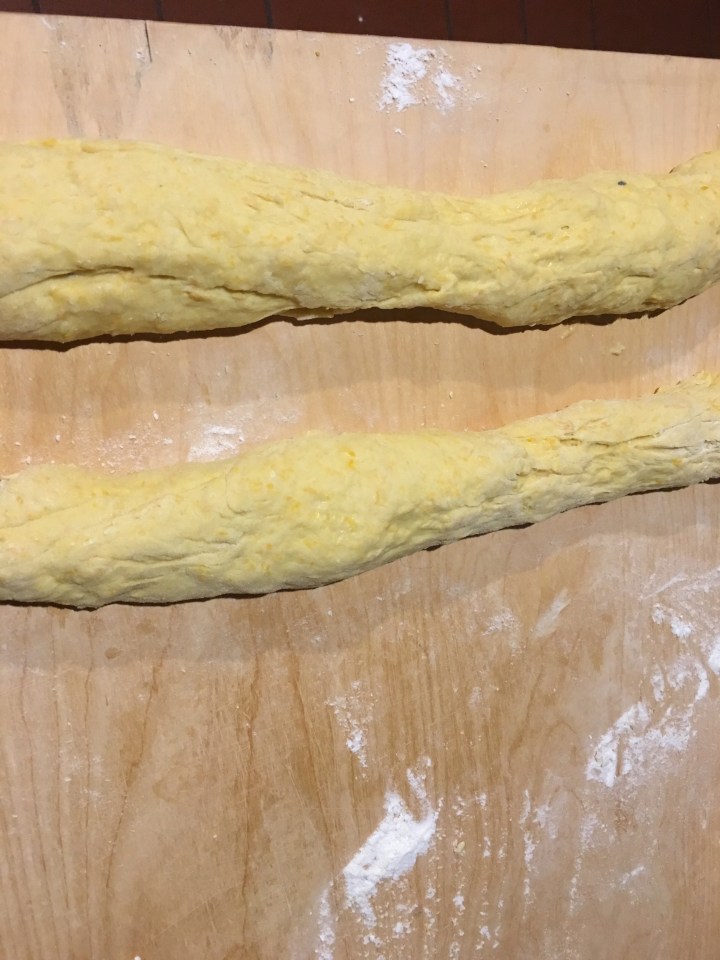 Sift the flour into a large bowl and mix the yeast .At the center, pour in sugar, salt and oil. Mix everything with a fork, adding a little at a time the warm pumpkin (37-40 ° C). Work the dough on the floured table top for at least 10 minutes, spreading it with closed fists, rewinding it on the table until the liquid is completely absorbed. Put it back in a floured bowl, cover it with a damp cloth and place it to rise in a warm place, until its volume is doubled (about an hour and a half). Divide the dough into 2 rolls about 40 cm long.