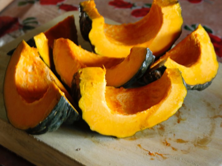 Peel the pumpkin, cut into slices and bake for 40 minutes.