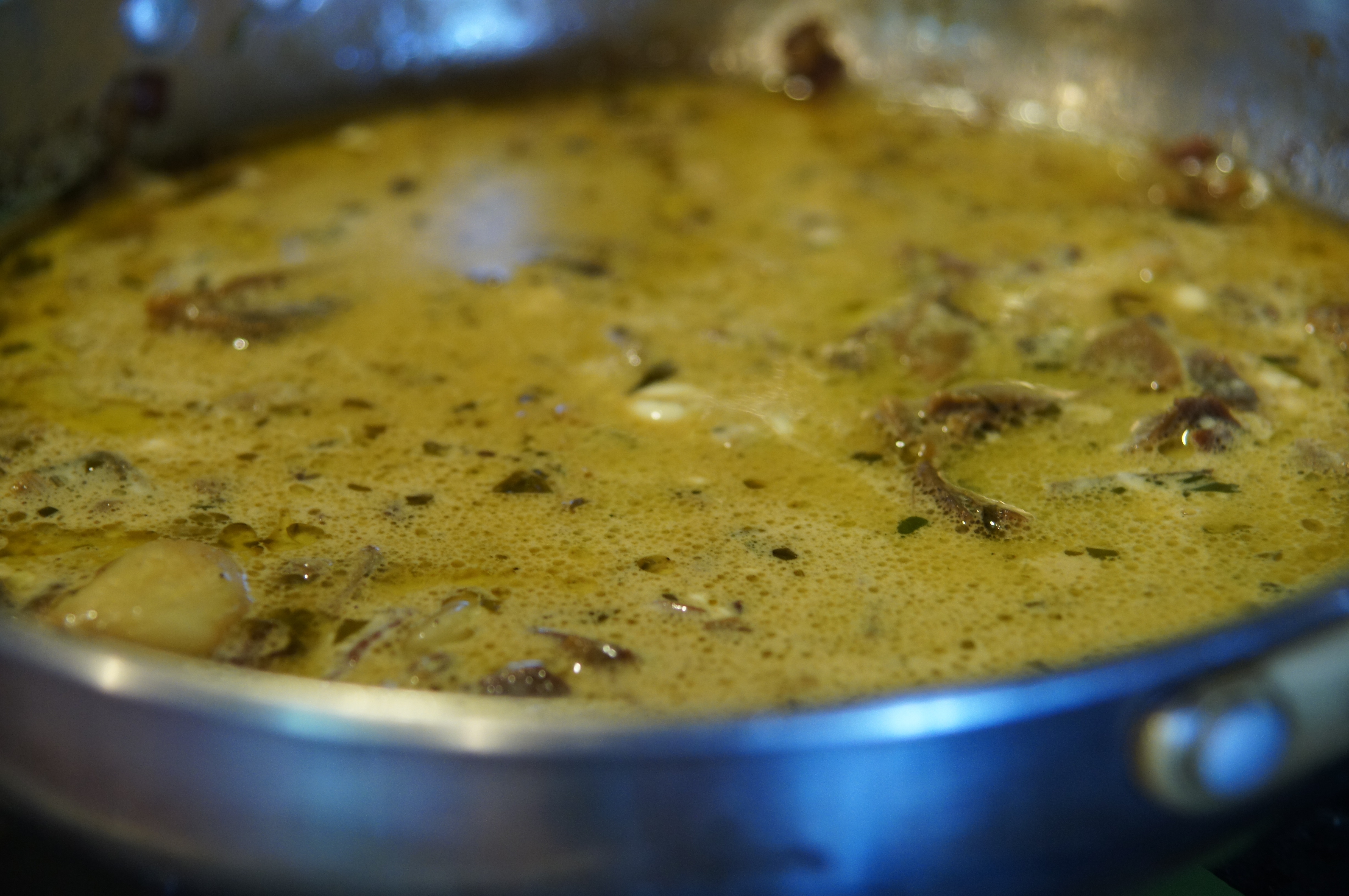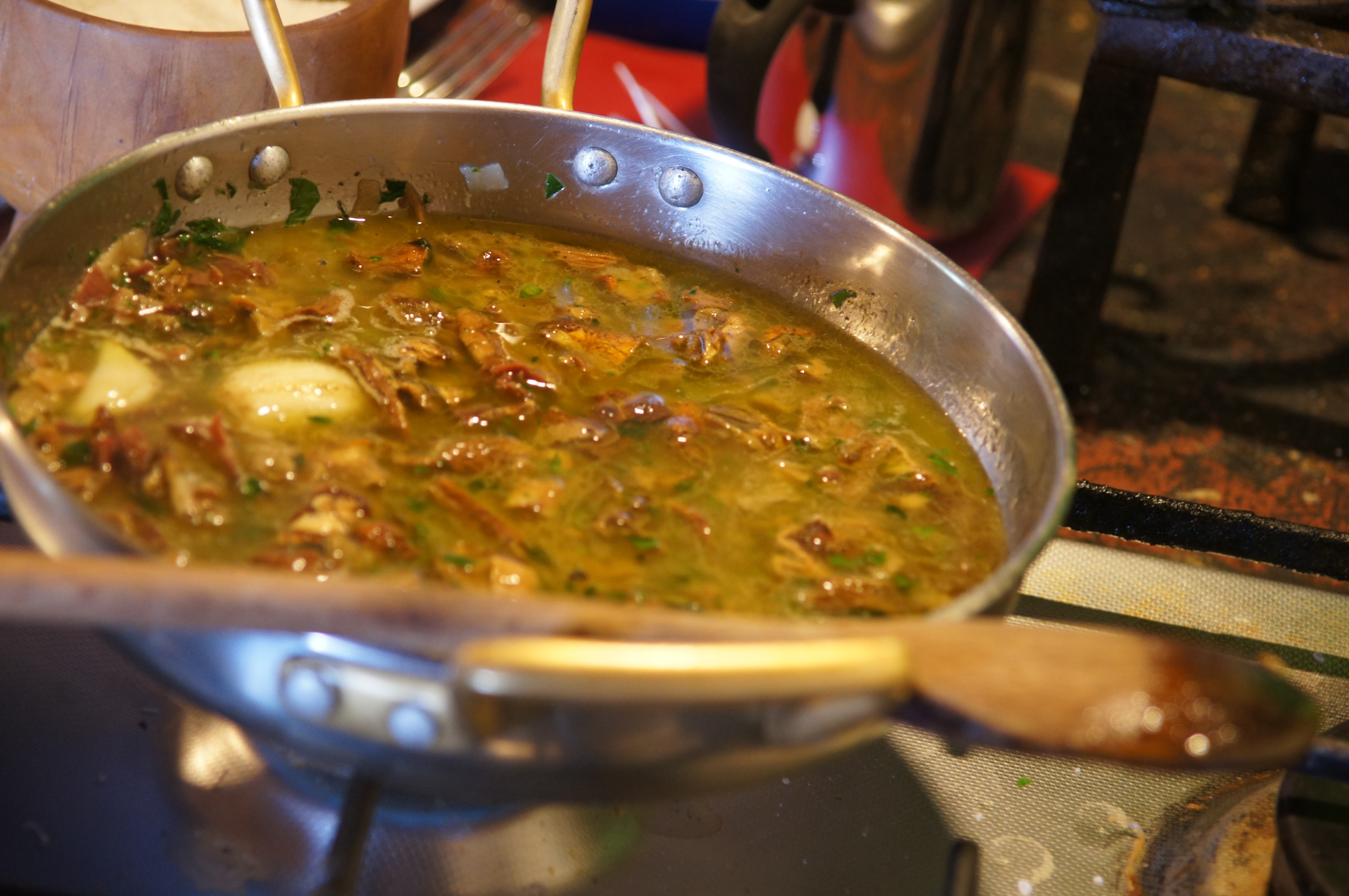 Add the mushrooms , add a glass of wine and when it evaporates add the liquid of the mushroom, salt and pepper.