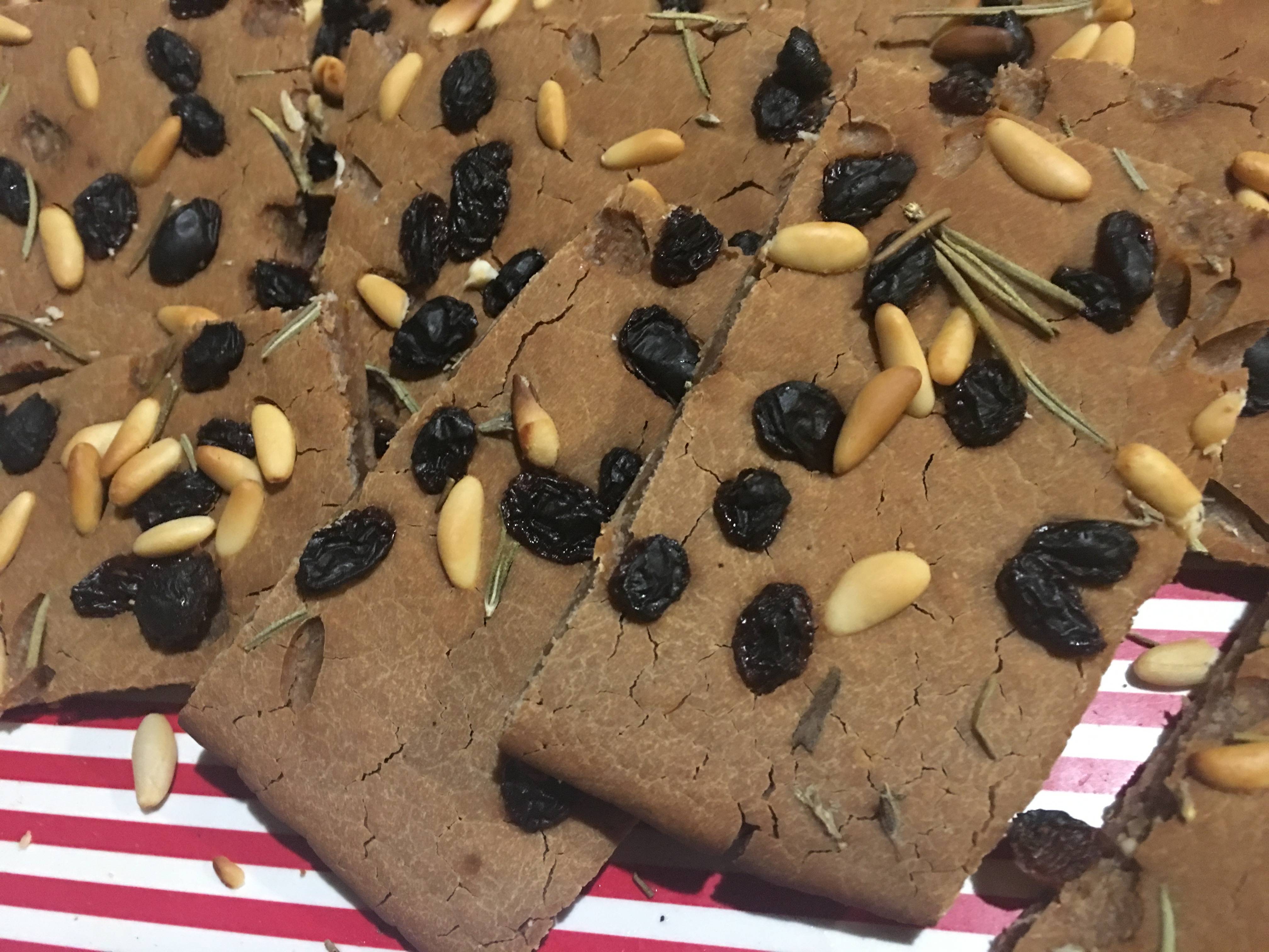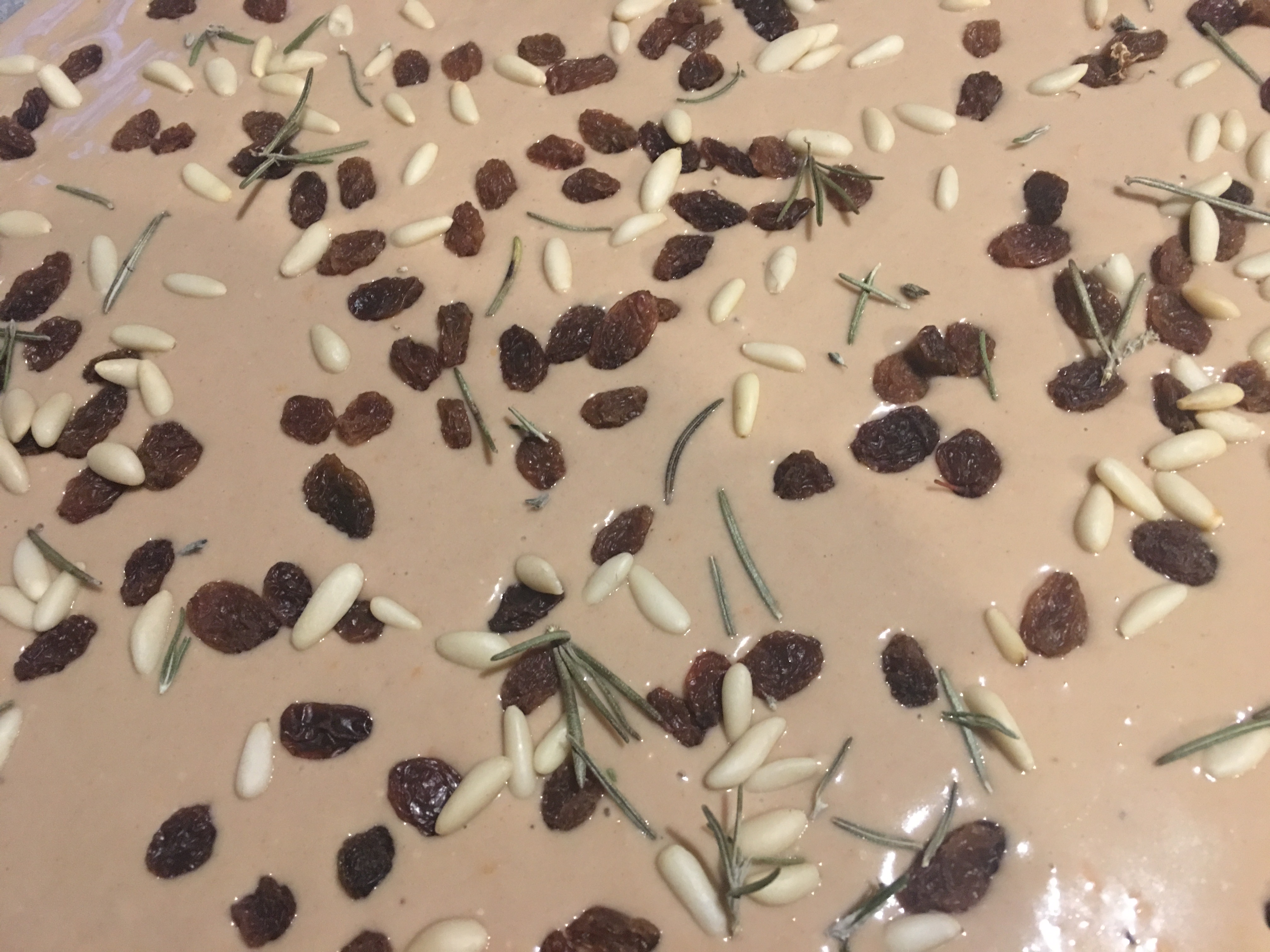 Sprinkle the top with rosemary, the sultanas, the pine-nuts