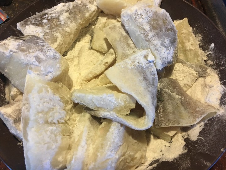Cut the fish into small pieces and lightly coat it with flour.