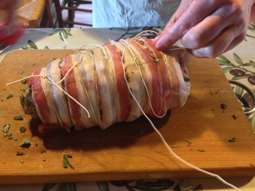Bind the meat and roll it in the very-finely chopped herbs and garlic to cover it with them