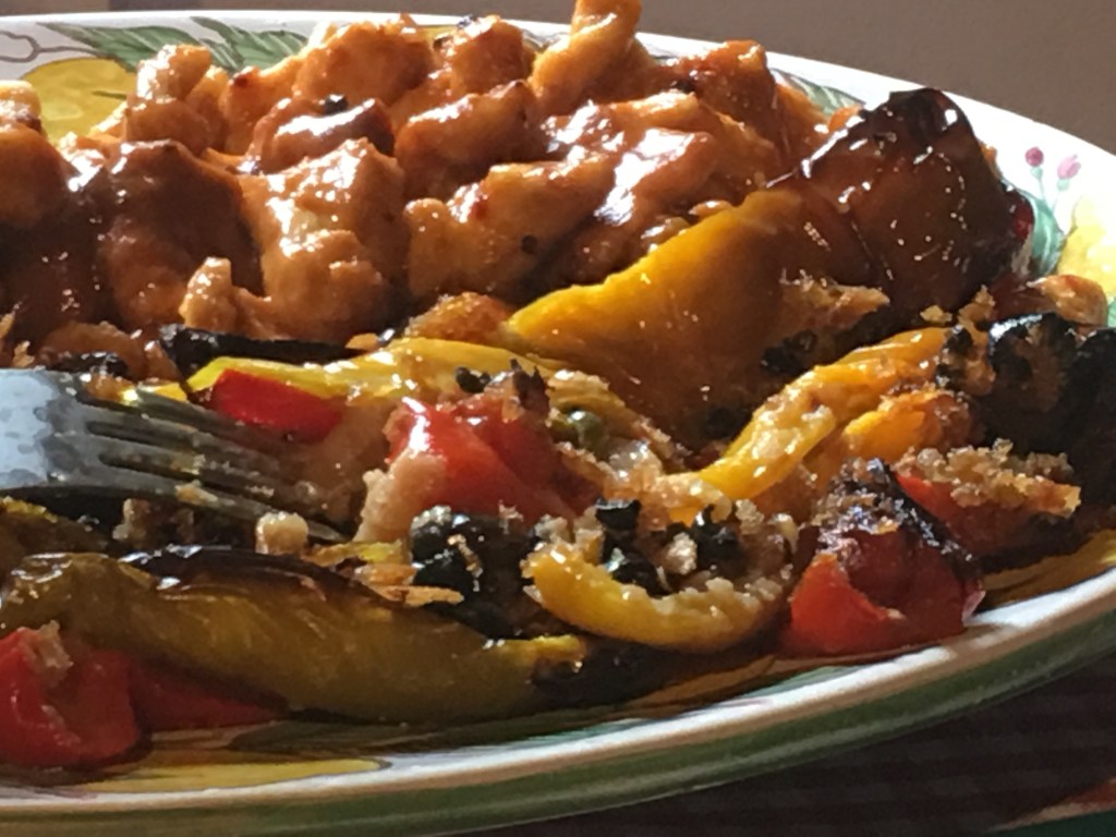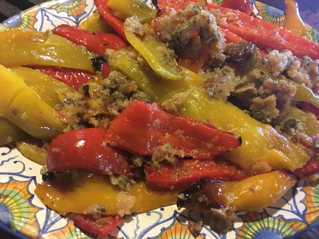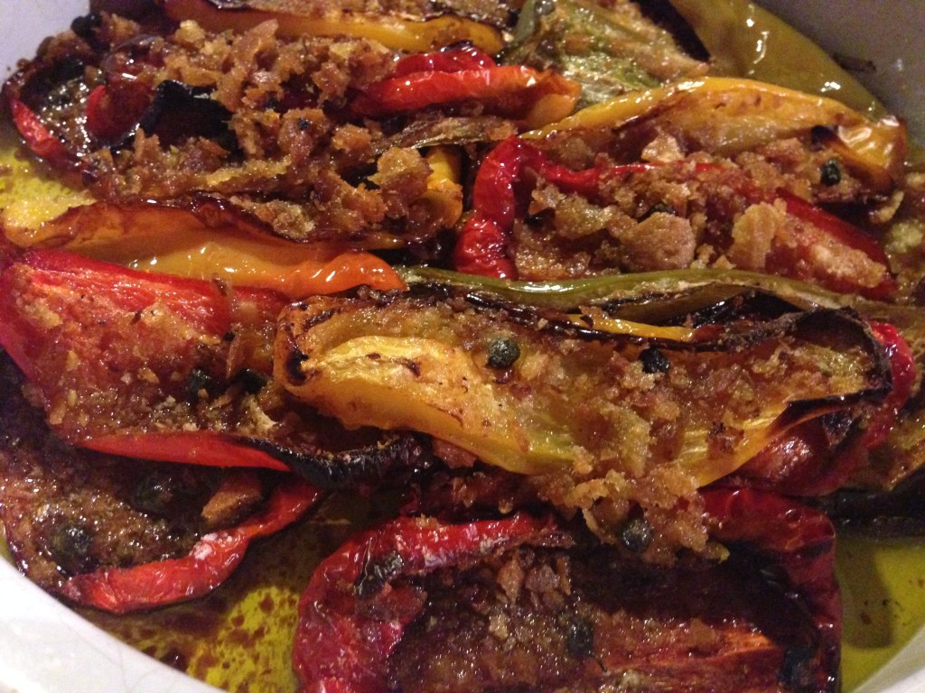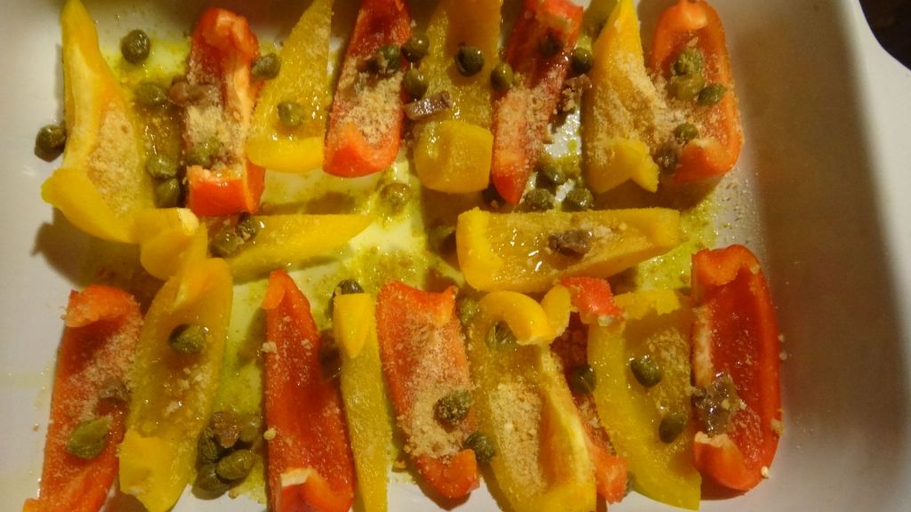 Proceed with an other layer of peppers, breadcrumbs ,capers and olive oil