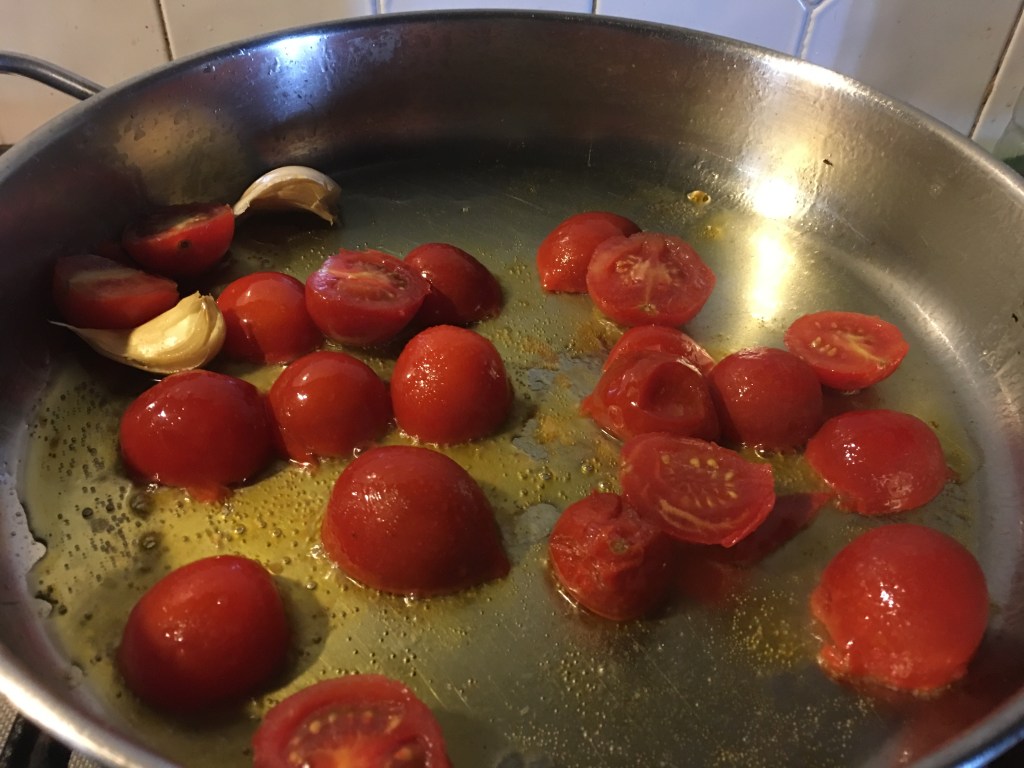 Wash the tomatoes, cut them into wedges and add them to the pan together with the friggitelli.