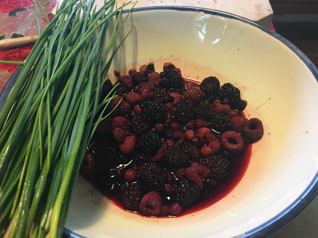 Let stand another minute without stirring and serve the rice and decorate each plate with a sprinkling of finely chopped chives and berries.