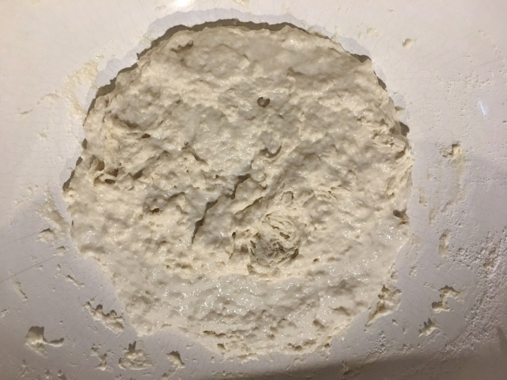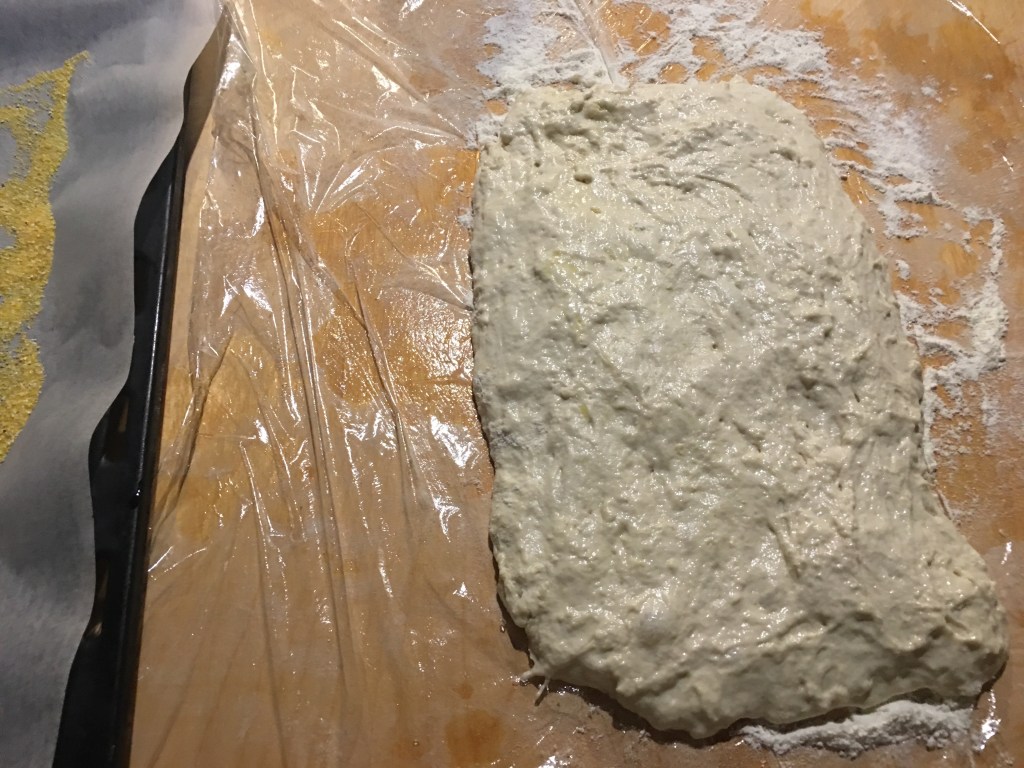 Grease your fingers and straighten the dough a little, always gently to give it a “ciabatta” shape