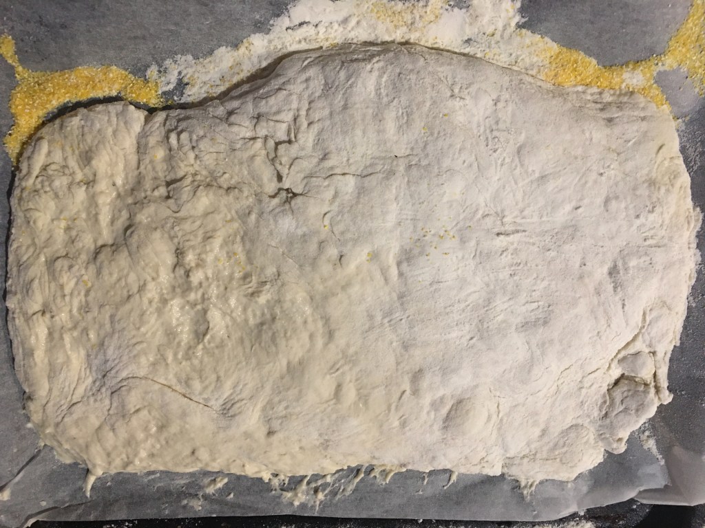 Place the parchment paper on a baking pan of adequate size and sprinkle it with polenta flour. The flour creates a thin layer of air under the ciabatta that cooks it better underneath