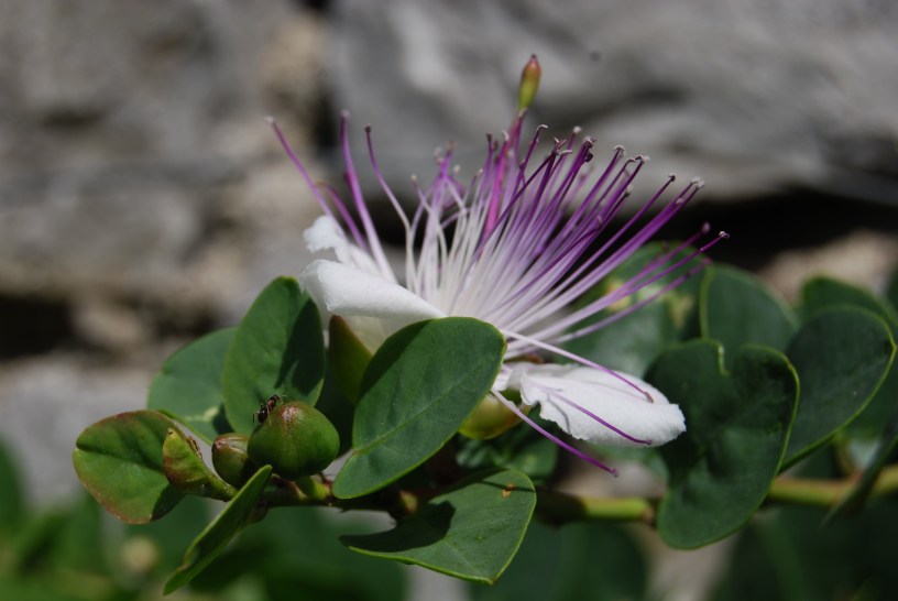 So let’s talk about the caper: a shrubby plant that grows throughout the Mediterranean basin. It grows on calcareous cliffs, on old walls, often forming tufts with hanging branches, even several meters long.In Tuscany you can see hanging on ancient towns’ or castles’walls.