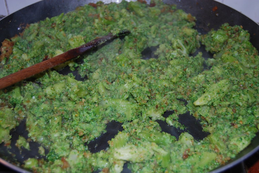 Add the breadcrumbs and when they are golden add the boiled cime di rapa.