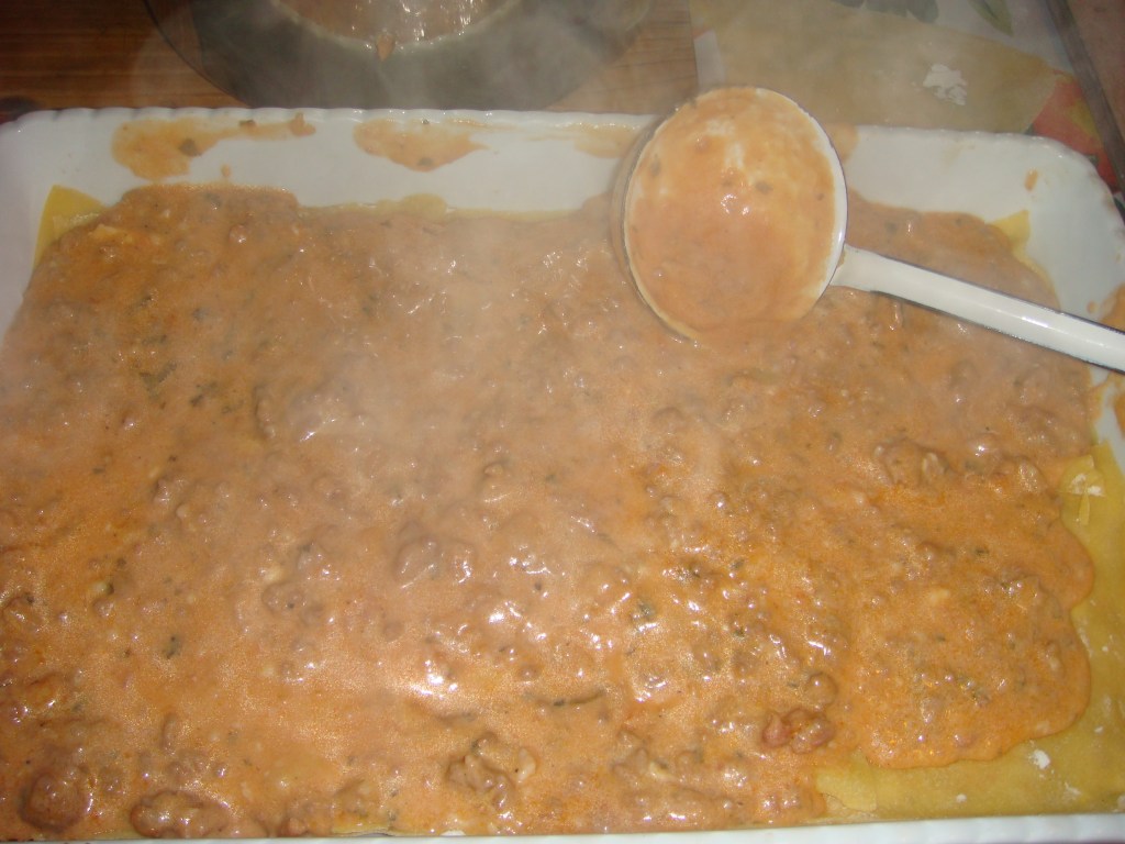 Continue to alternate layer after layer until the lasagne are finished . On top a layer of béchamel.Some people prefer to complete with a layer of lasagne.