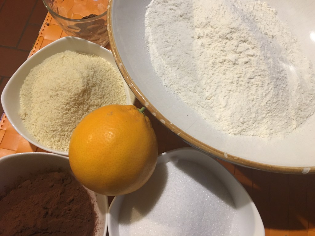 Mix together flour, almonds, sugar, sifted cocoa, ammonia or yeast, pisto, spices, salt, finely grated orange peel