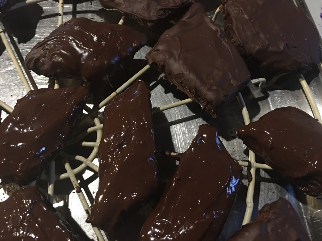 When the mostaccioli are cold, glaze them with chocolate. Adding a spoonful of fondant on each.