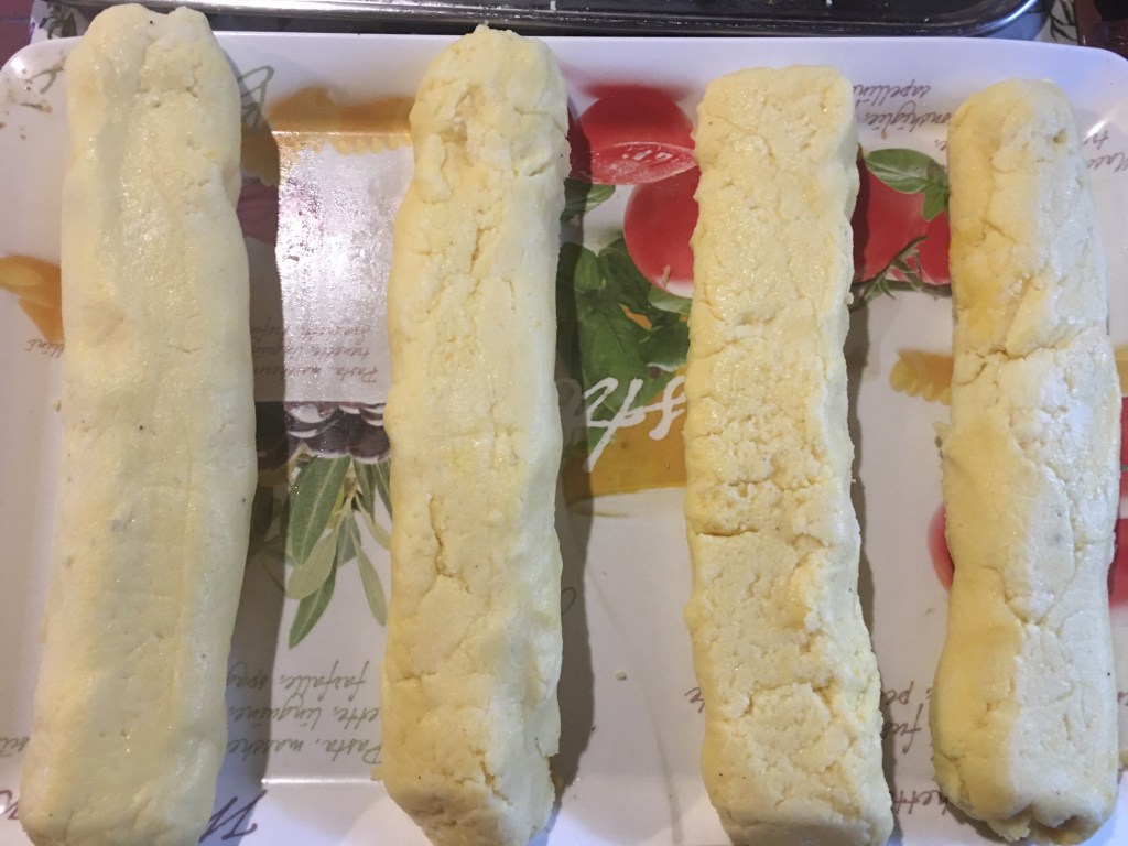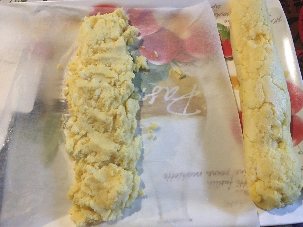 A trick , to simplify the preparation: arrange a piece of parchment paper on the table, pour some of the mixture on it and form a cylinder of 4 cm.diameter by rolling the dough with the help of the paper.