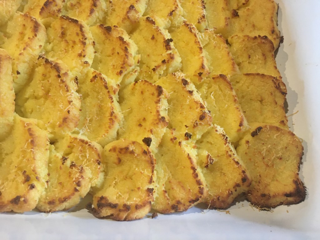 In an ovenproof dish make 3 or 4 layers of the discs .In between each layer and on top, sprinkle melted butter and Parmigiano .