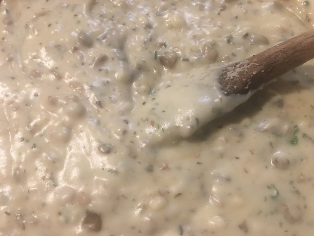 Remove the cooking liquid and add the mushrooms to the bechamel.