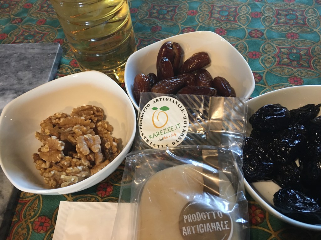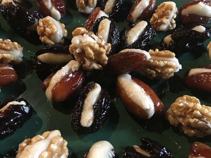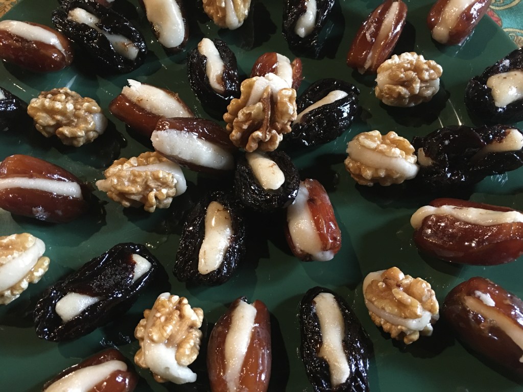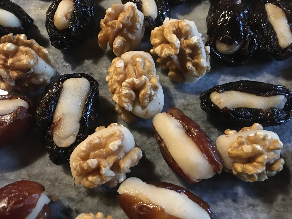 Give the pasta the shape of a breadstick and fill the dates and plums one by one with small pieces of it. Use it for nuts.