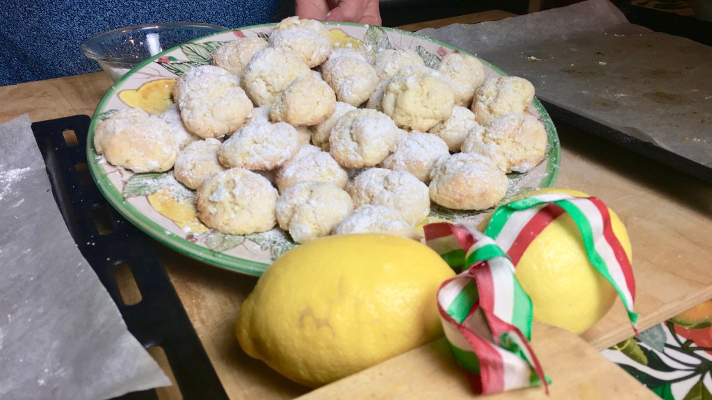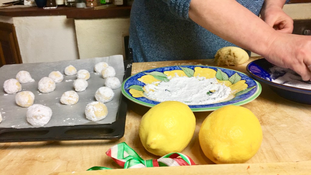 buccia grattugiata di 2 limoni – succo di 1 limone – 1 uovo – 1 cucchiaino di lievito per dolci Vaniglina in polvere o 2 gocce di estratto -150 gr di zucchero a velo per rotolare i biscotti