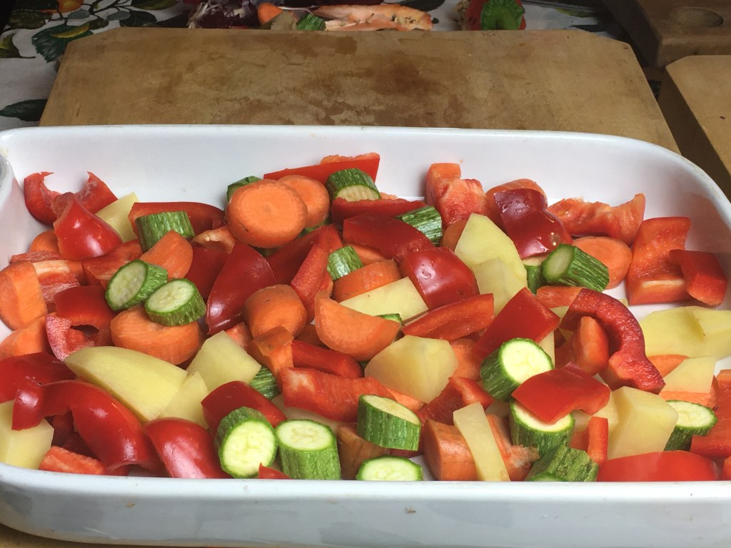 In the meantime, cut the vegetables into slices or pieces and arrange them in an ovenproof dish, add 2 tablespoons of oil.