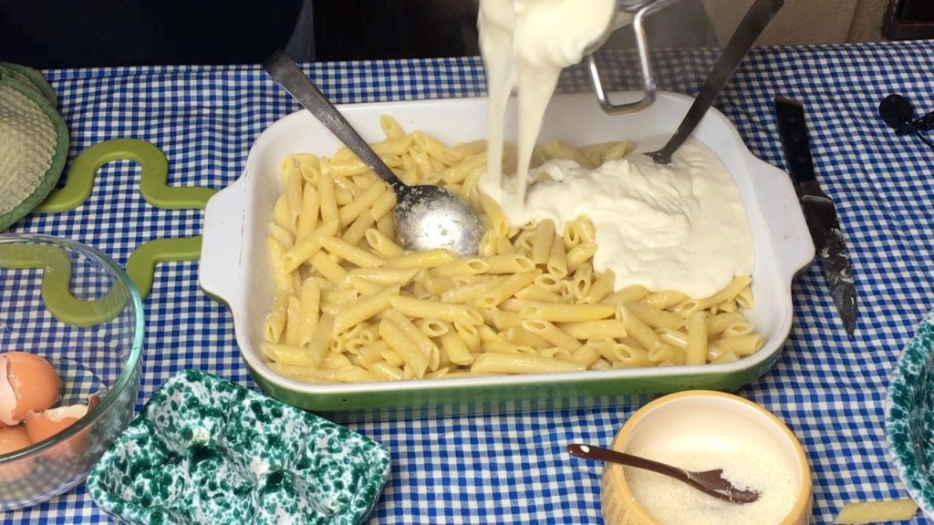 Pour the rest of the bechamel onto the pasta.