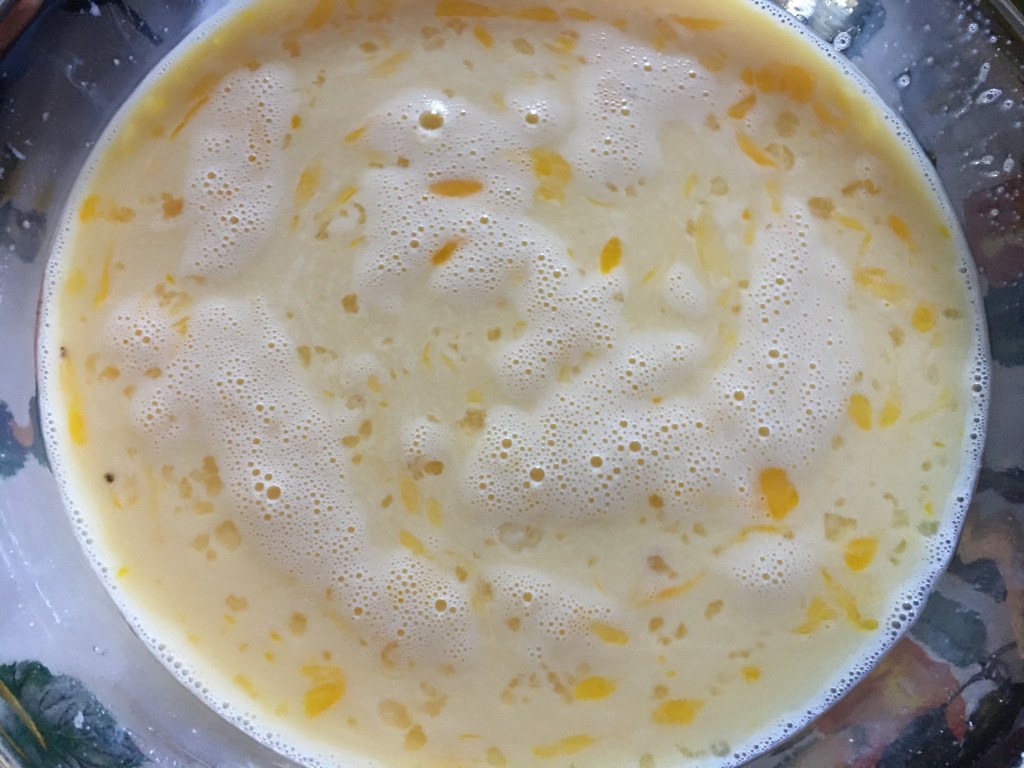 When the milk is cold, add the eggs, a pinch of salt, and finally add the liqueurs. The eggs must be mixed without letting them mount.
