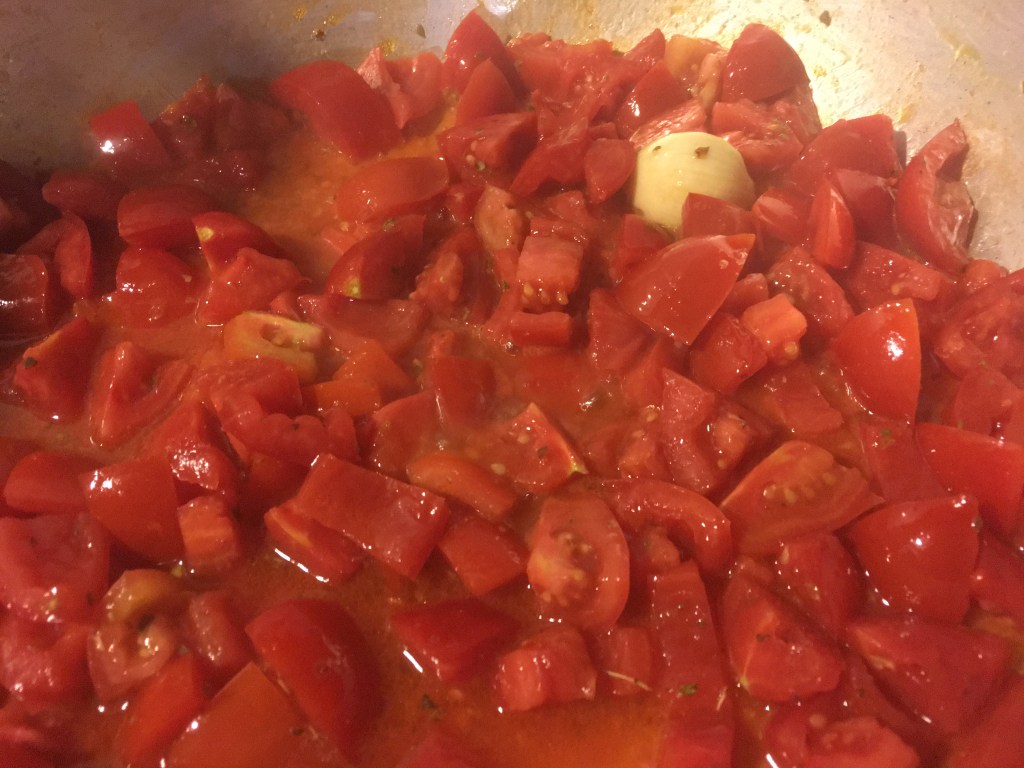 - Versate l’olio in una padella antiaderente, aggiungete quindi uno spicchio d’ aglio in camicia, i pomodorini