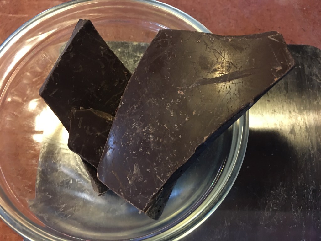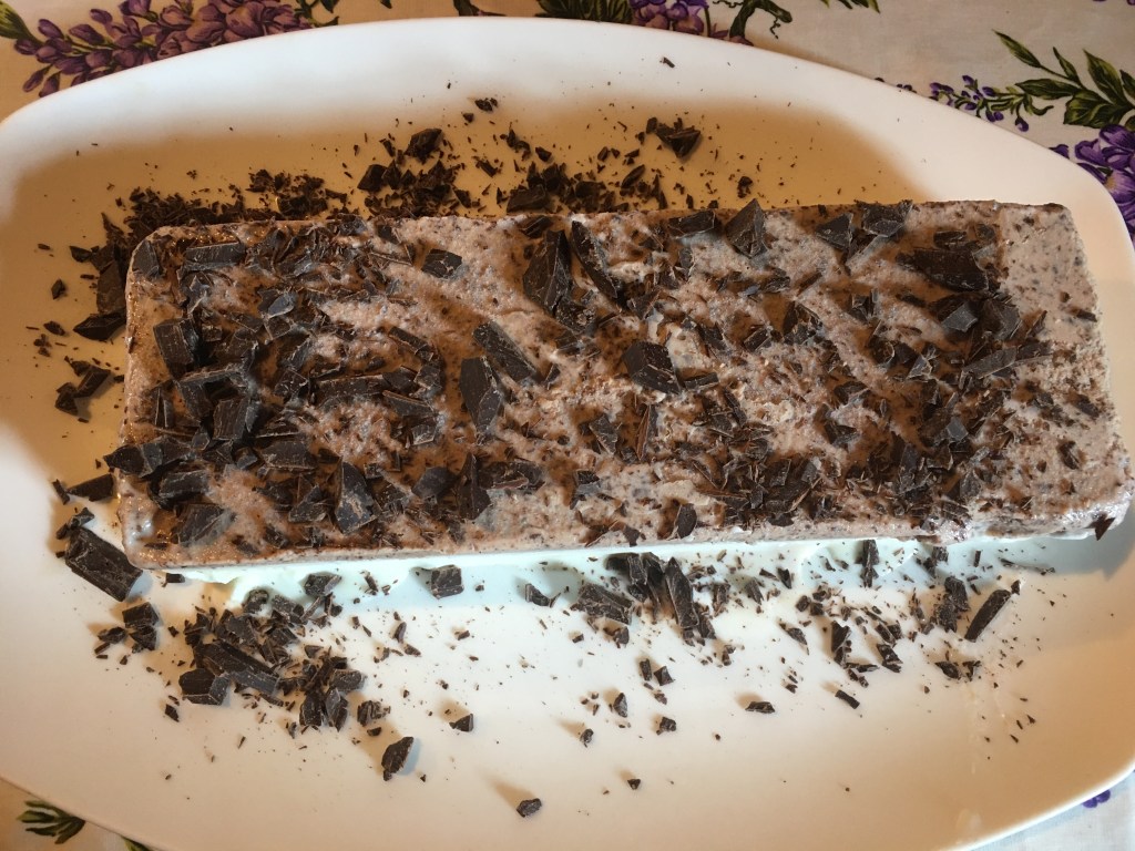 We let it freeze for at least two hours and then serve our chocolate cake with pieces of dark chocolate all over.