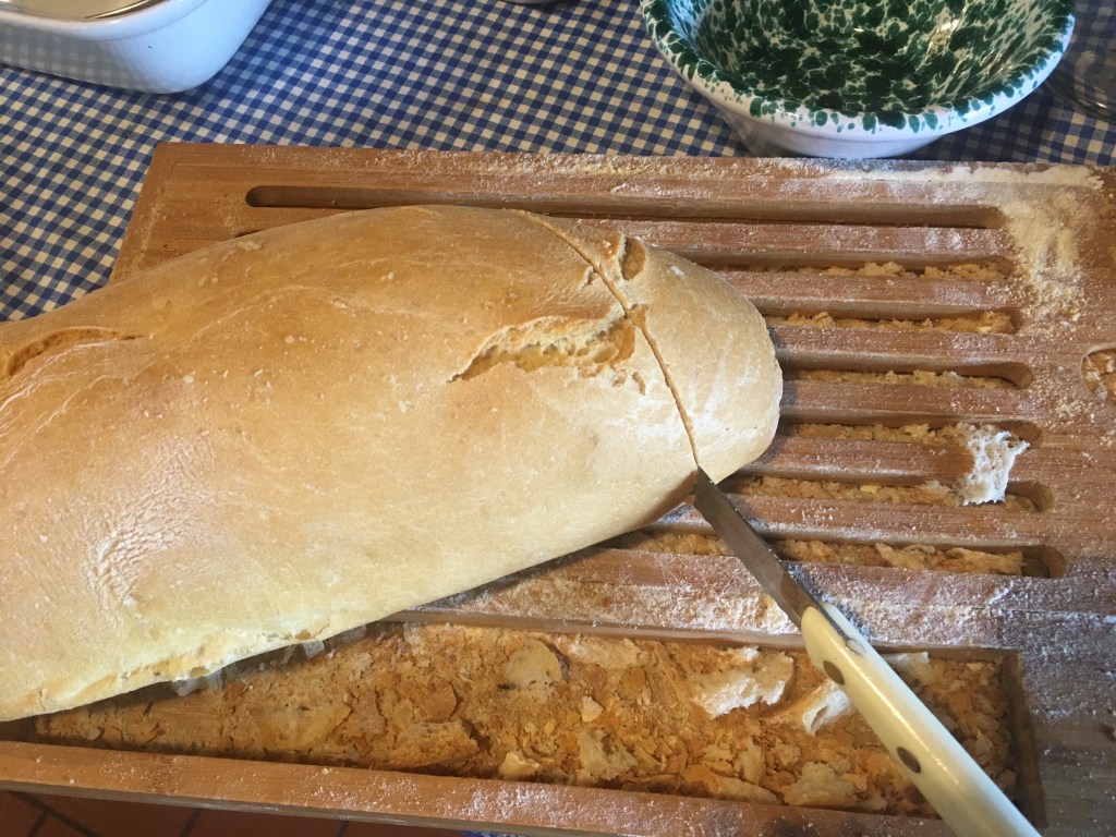 To help us even more we can slice the bread on the cutting board that collects the crumbs so we will already have some large breadcrumbs ready and then we can pass it in the machine if we want to finish it. In fact we can use half for ourselves and half for the birds in the yard.