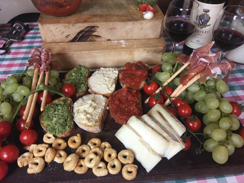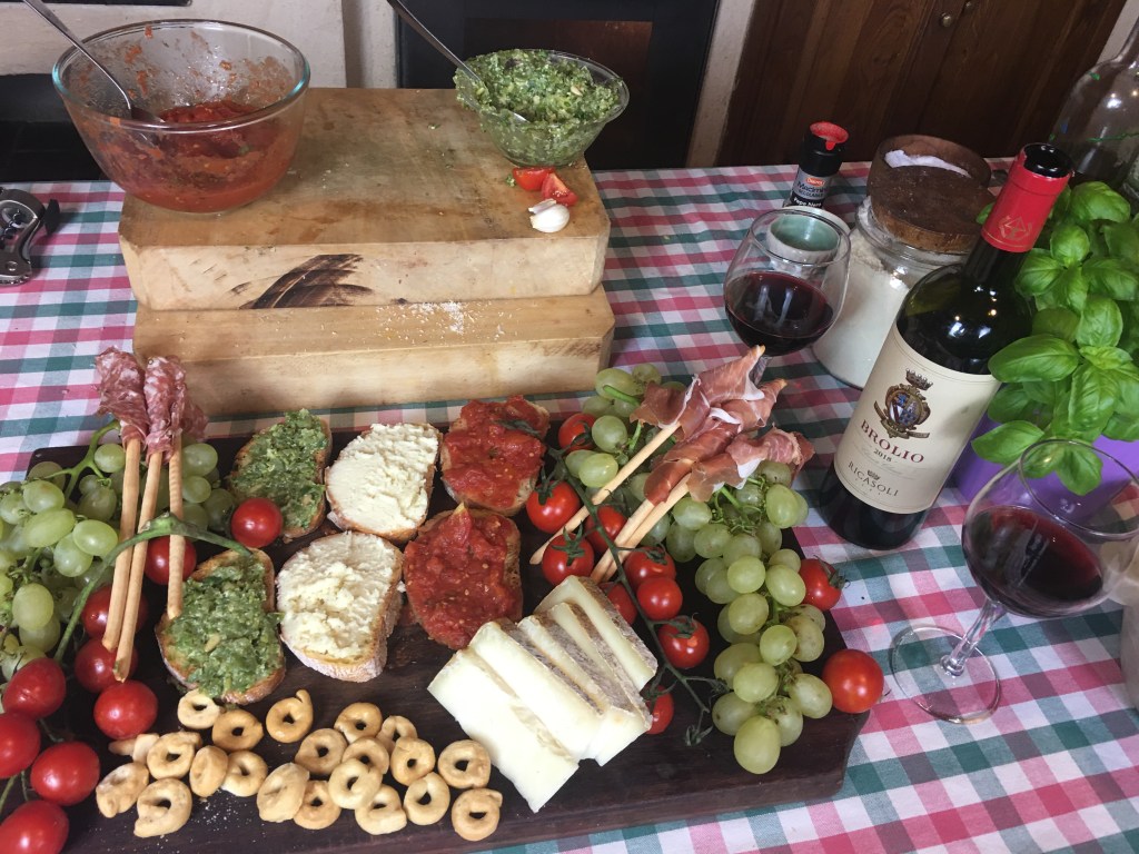 In Tuscany an aperitif such as an appetizer is usually organized with salami, prosciutto and crostini.Crostini or crostoni is a slice of bread with a tasty sauce on top.During a Private Virtual Cooking class we offered this idea an prepared 3 different crostoni .We chose the colours of Italian flag and so we had crostini al pesto and green beans , crostini with cheese and tomato bruschetta.Sincerely the experience was great and tasty,accompanied by a nice Chianti Classico wine.