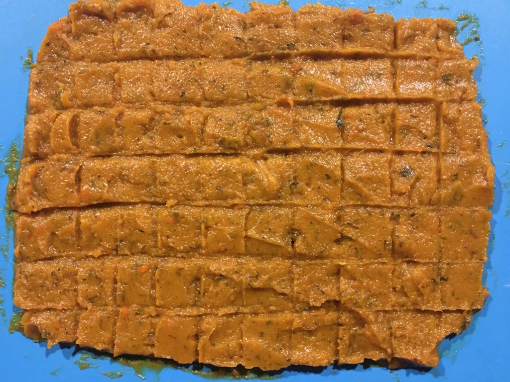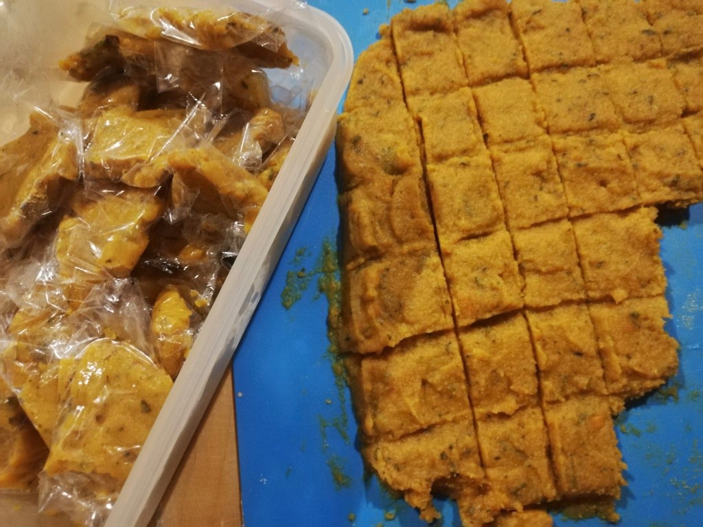 -spread the mixture on a tray and cut everything into cubes and put in the freezer to harden. Now remove the vegetable cubes gently, be careful because they are not hard. Wrap them in plastic and place them in a container that you can keep in the freezer, taking one cube at a time whenever necessary.