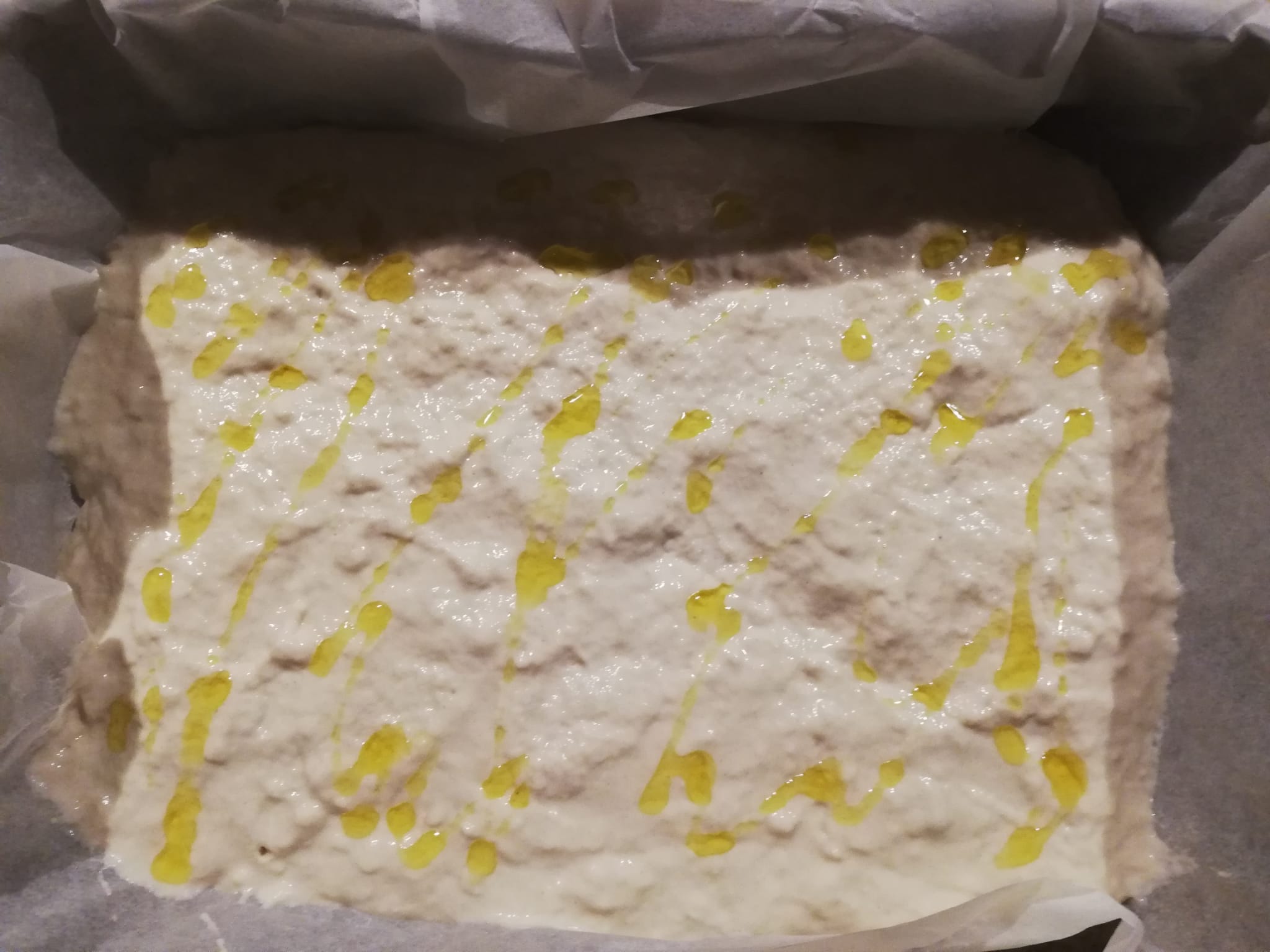 Grease the surface of the focaccia without dough a little with extra virgin olive oil and let it rest for another 20 minutes.