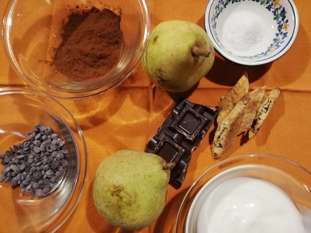In a glass cup layer in succession: a few drops of chocolate, a layer of yogurt, a sprinkling of cocoa, layer of pears’peels , a layer of crumbled biscuit.