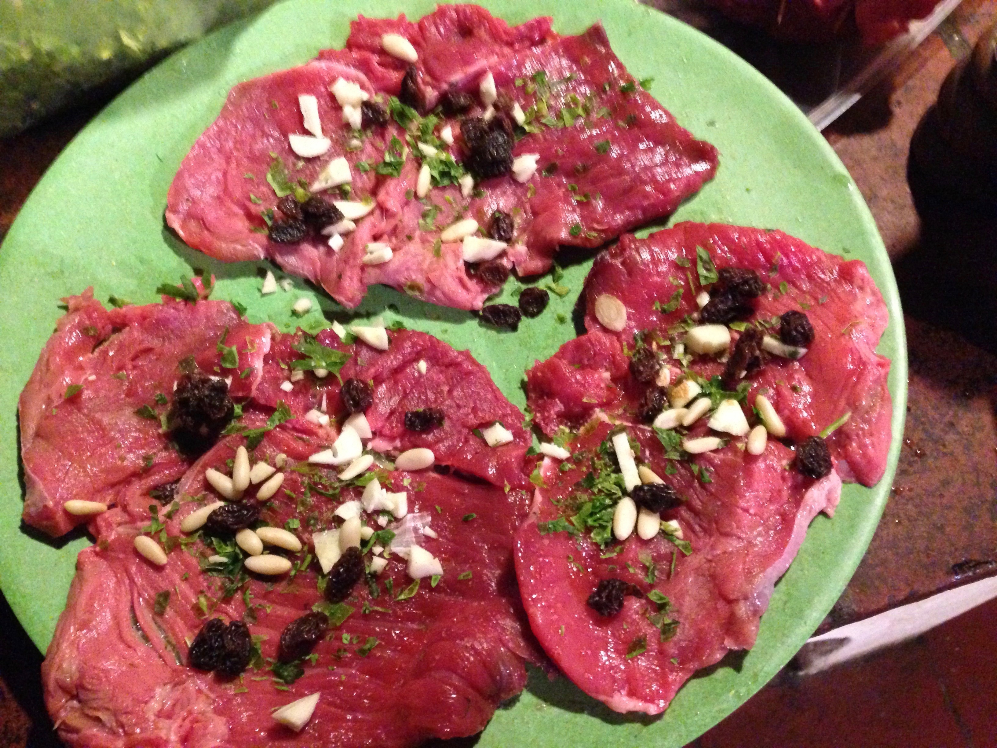 Sprinkle the slices of meat with salt and pepper, then add a handful of pine nuts and raisins.