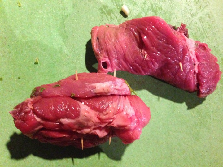 Close the slices by rolling them and seal them by inserting 4 toothpicks transversely into the chop.