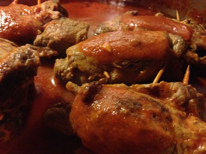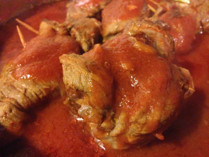 Let the braciole cook with the sauce over a very low flame for at least one hour. The sauce will have to, as they say in Naples, “pippiare “word onomatopoeic that describes the sound of the ragu’ that is simmering. At this point, remove the lid and narrow the sauce