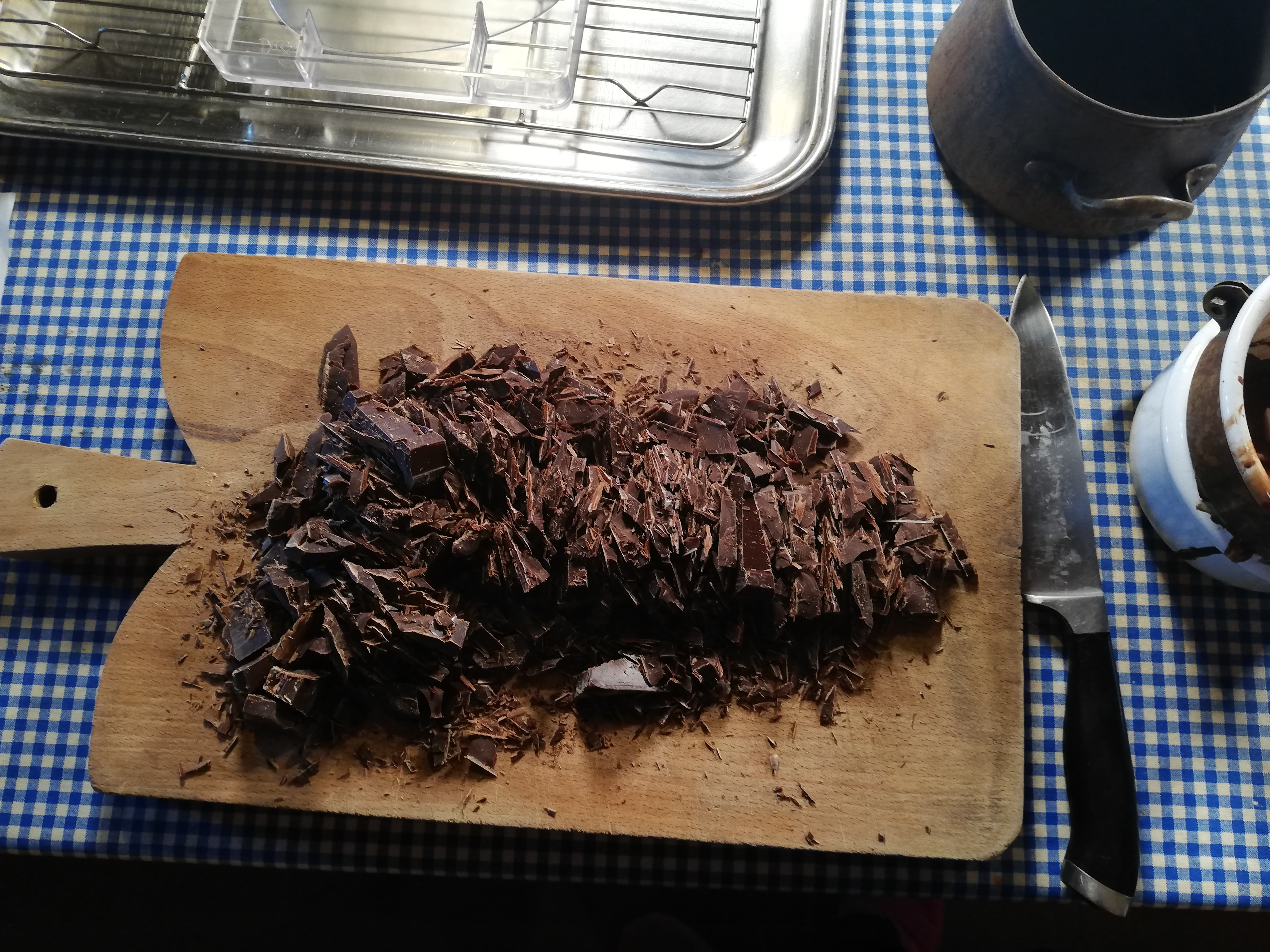 To prepare the dark chocolate Easter egg, start with the tempering of the chocolate: chop the dark chocolate.