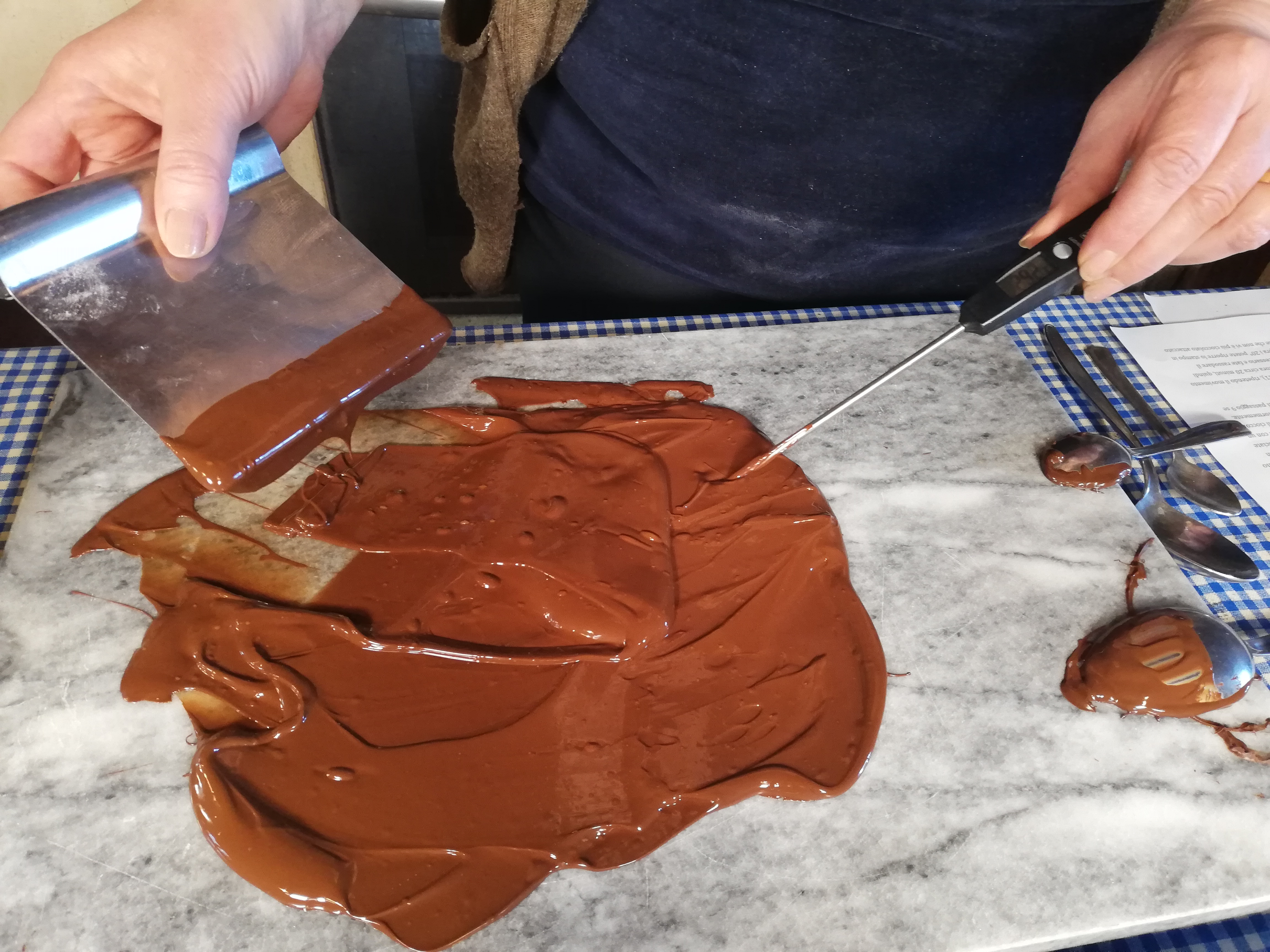 Start working the chocolate on the slab with a spatula and a scraper, laying it on the surface. When it has reached 28° C/82.4°F (always measured with the kitchen thermometer) , transfer it to the bowl where you have left the remaining 1/3 of chocolate and mix . Chocolate must reach 31°C/87.8°F. If the temperature drops too low at these stages, always keep the bain-marie pot handy with hot water, to heat the chocolate slightly. On the contrary, in case it is still too hot, repeat the operation of spating on marble with a small part of the chocolate.