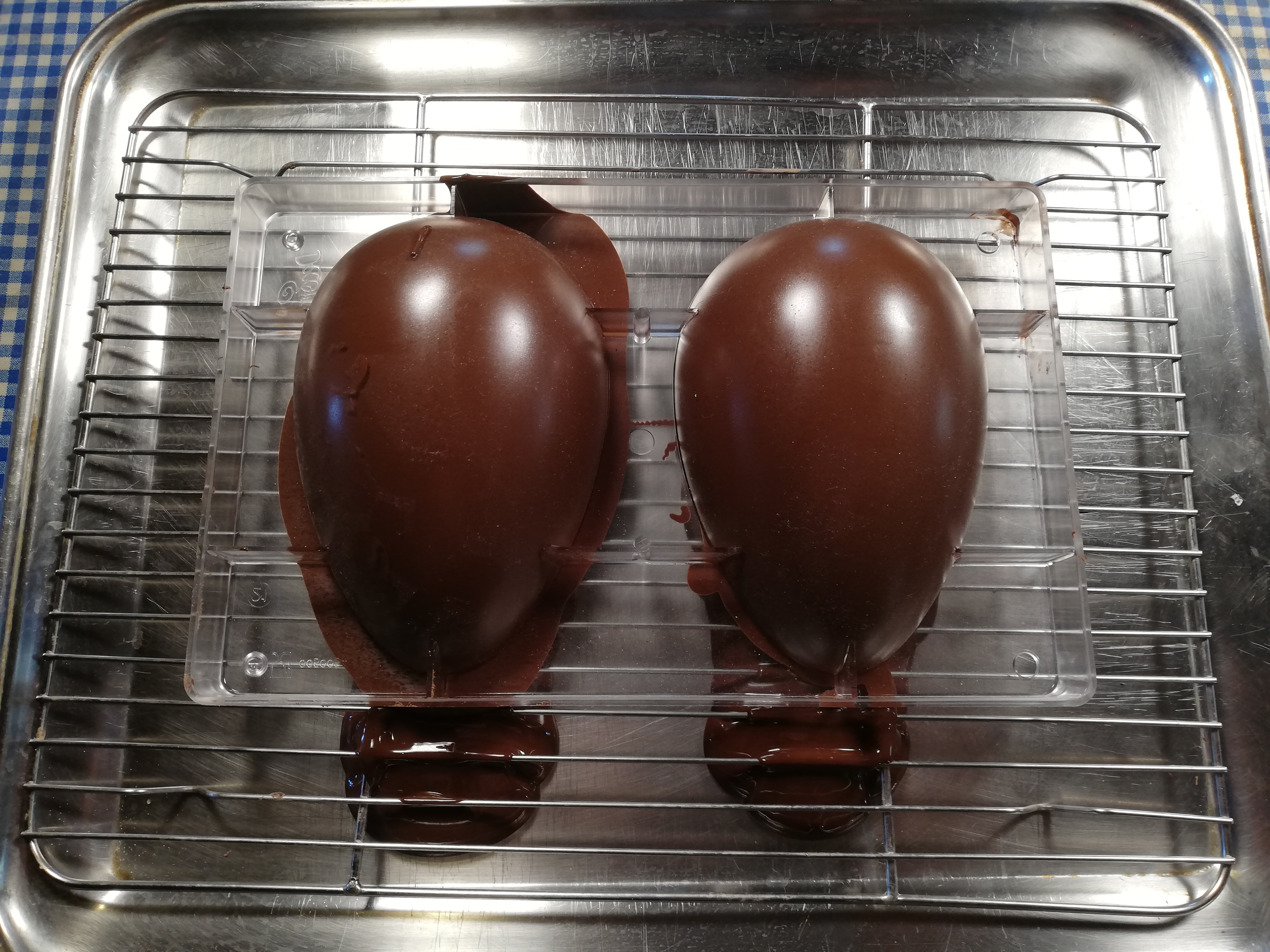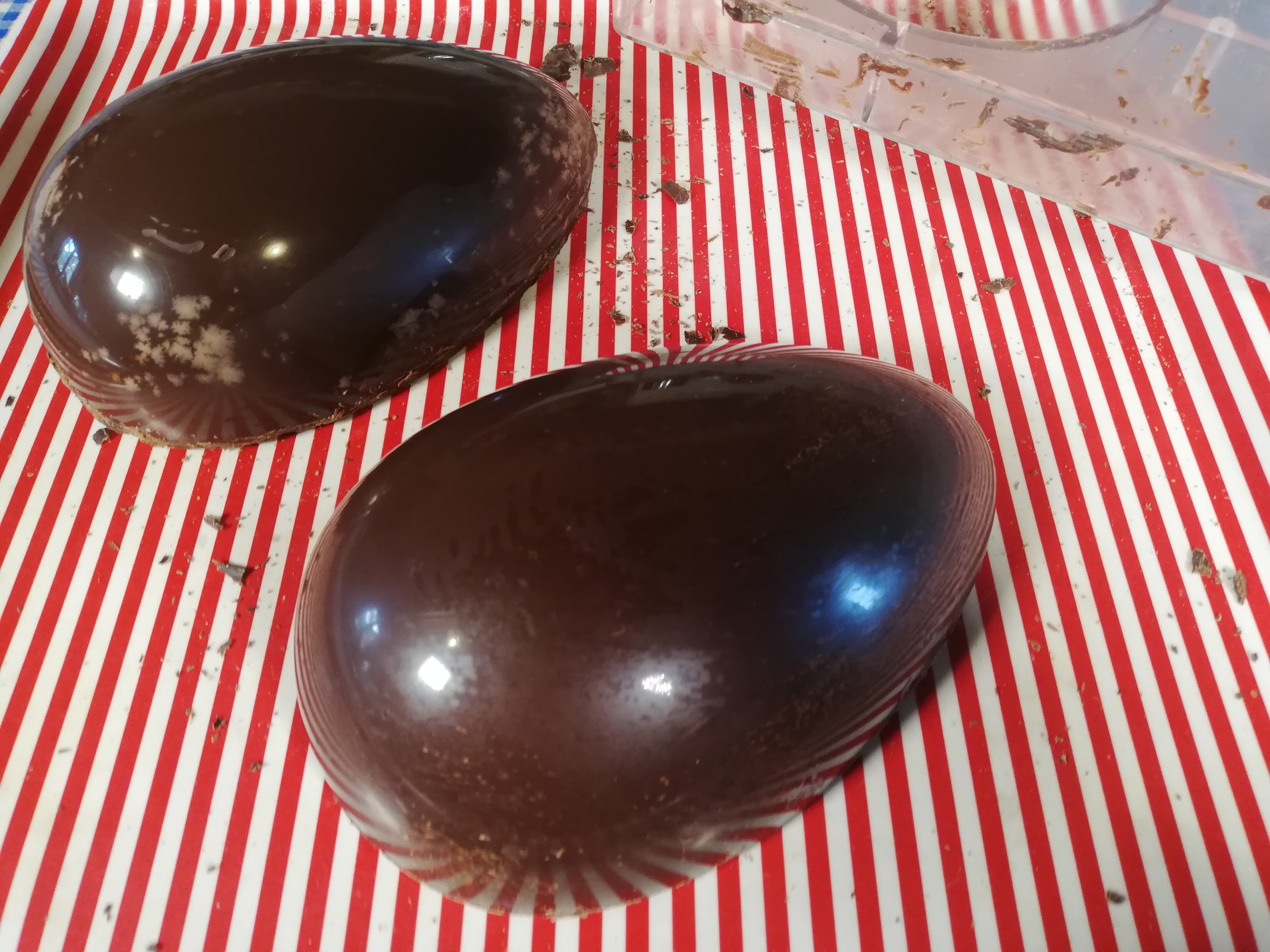 Then pour the excess chocolate back into the mold ,repeating the rotary movement to distribute it evenly. Crystallize again about 20 minutes, then remove the chocolate spikes if necessary and have the chocolate firmed for 2-3 hours. If the outside temperature is above 20°C/ 68°F you can store the mold in the refrigerator. When it is well crystallized, you will find that there is no more chocolate attached to the mold and you can gently draft the two halves of egg by putting a slight pressure on mold. You can also delicately beat on the mold with the back of a knife(delicate !)