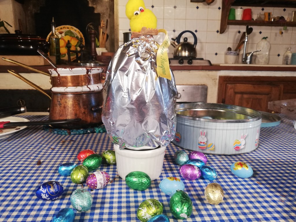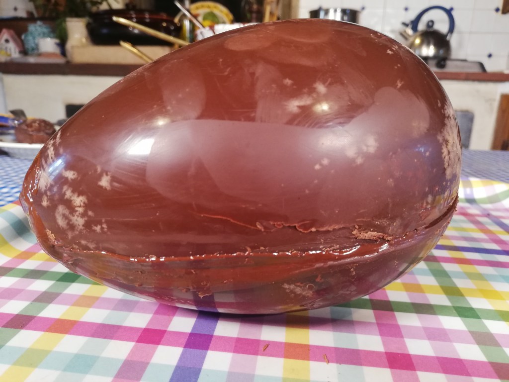 The dark chocolate egg is ready to be gifted and then enjoyed on Easter day.