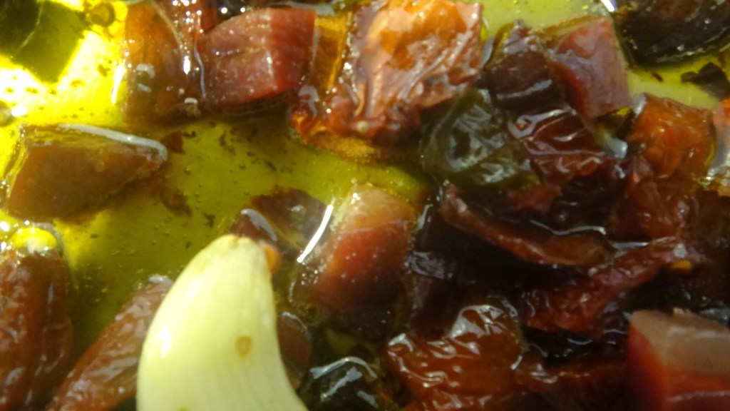 Pour one tablespoon of the oil from the dry tomato’s jar and 2 tbs. of EVOO into a pan