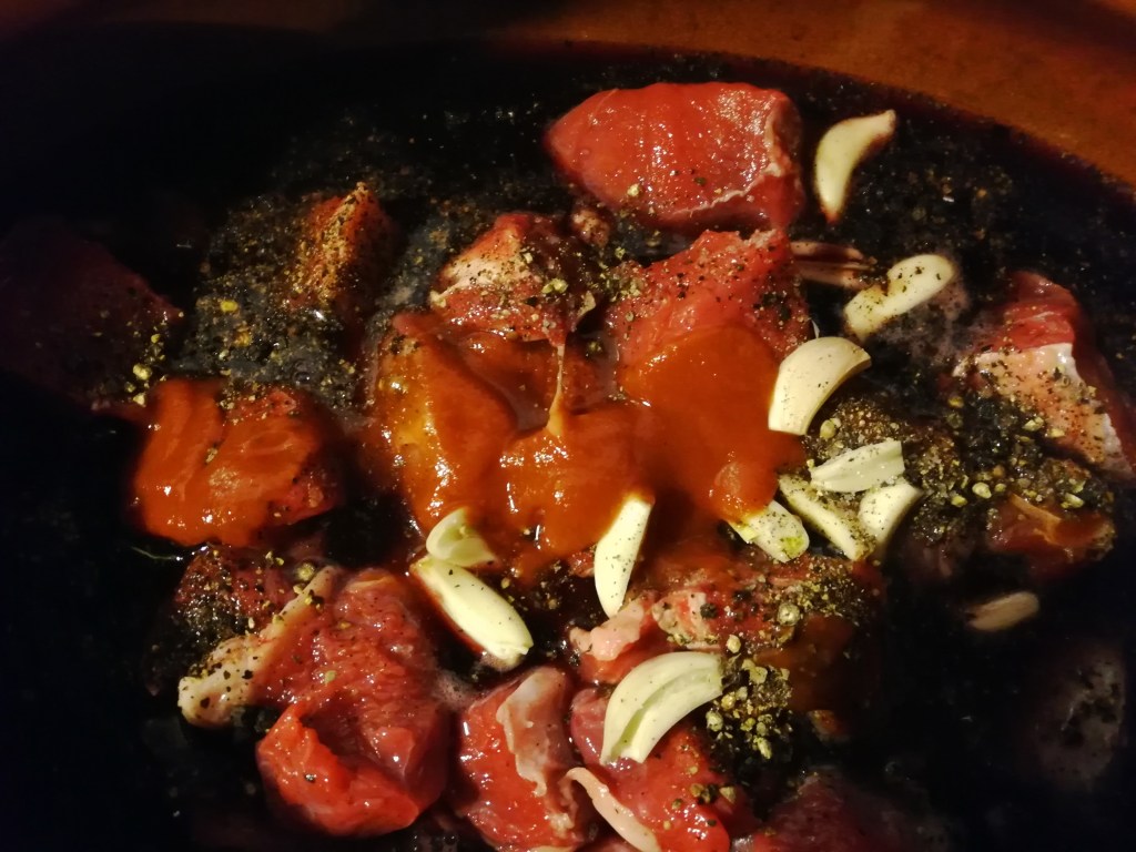 I cook it in a pot, using a piece of coccio/terracotta, alternatively you can use a cast iron pot to retain the heat and release it slowly ensuring a tender and tasty meat.