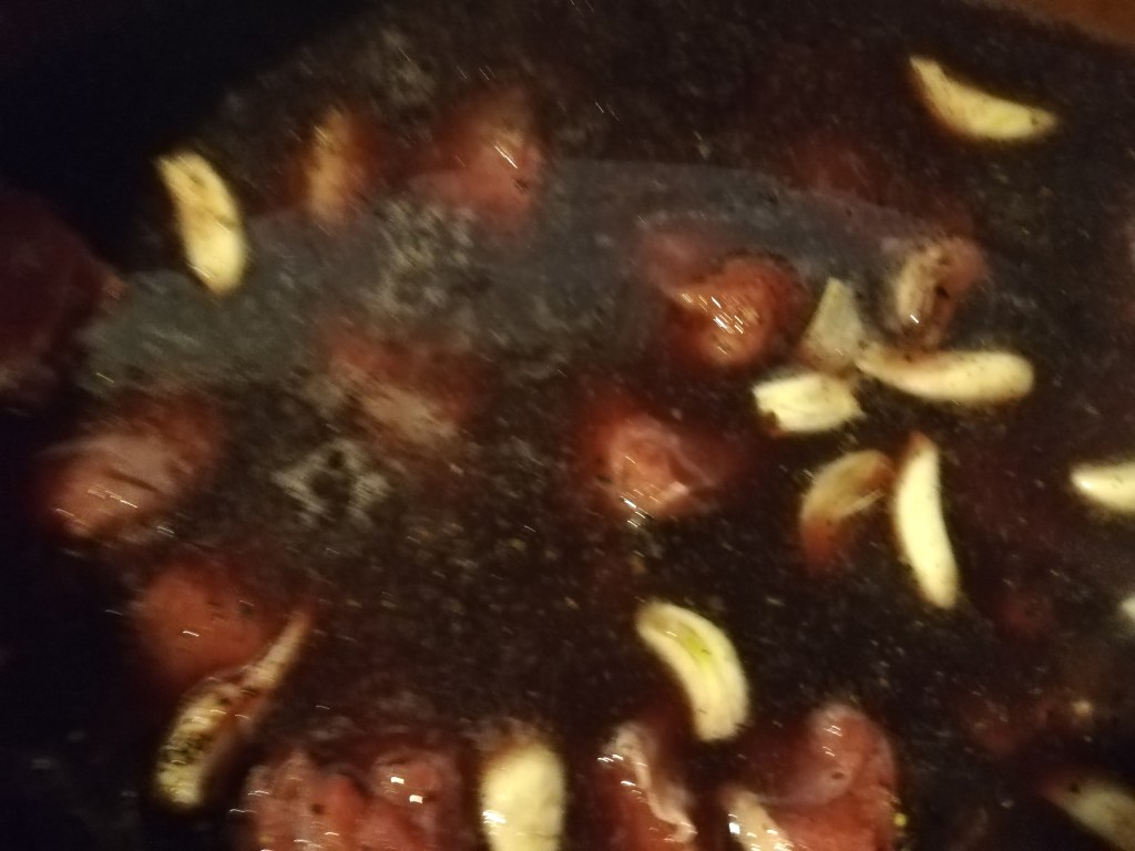 Put the meat in the pot with the peeled garlic cloves and add the wine; do not add oil (unless the meat is very lean)