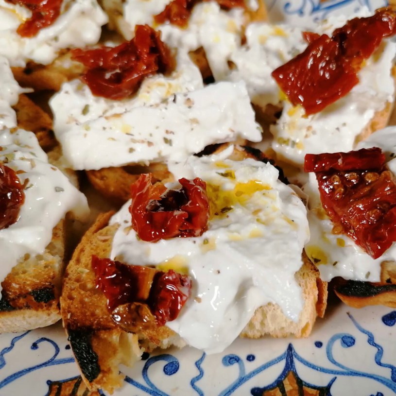 Your bruschettas with burrata are ready to be served! Simple but intense flavor
