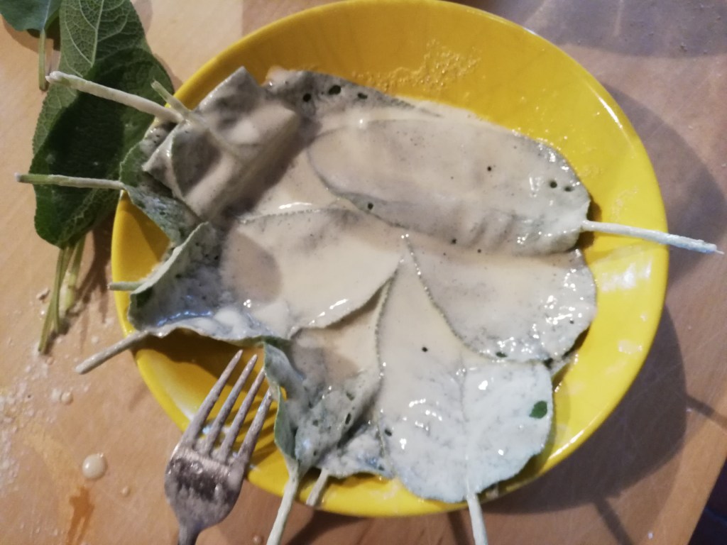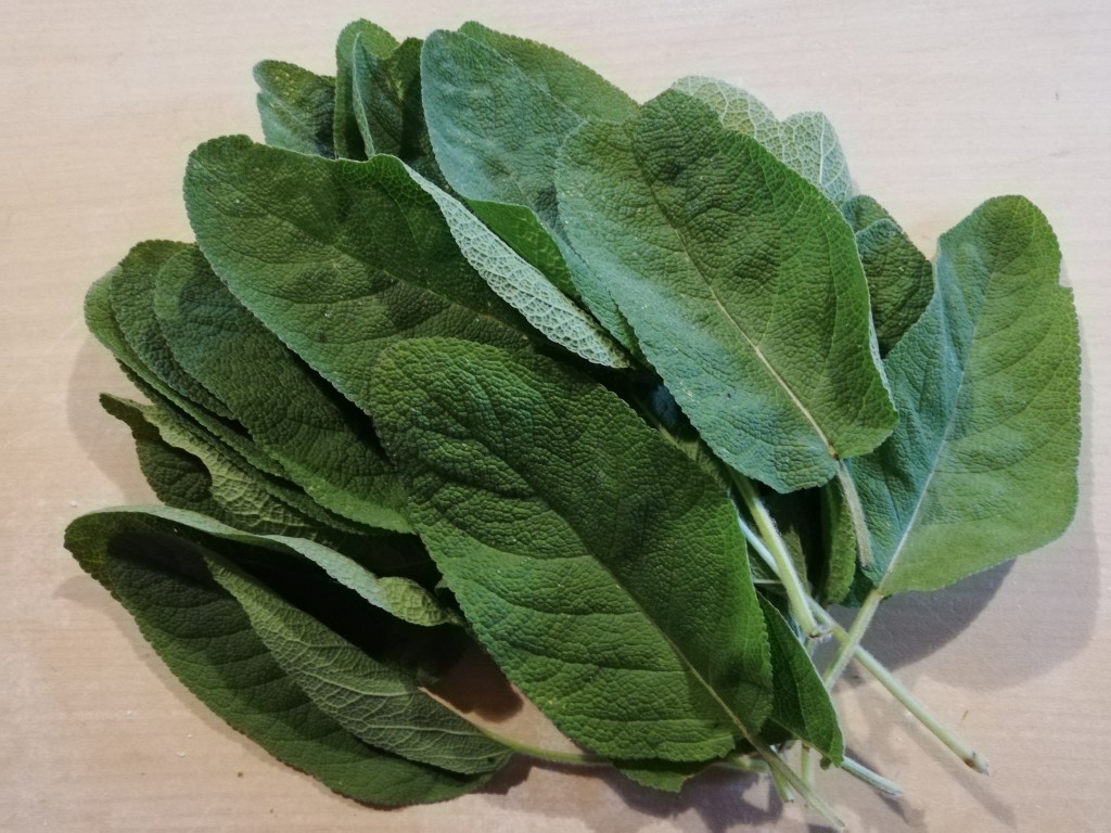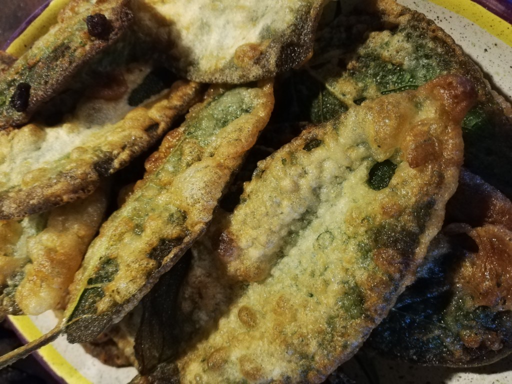 In this season the herbs are at their best and the sage is a good example. We cultivate also what’s called sage maxima, so we can get large leaves. As an appetizer, to be served with a aperitif these large leaves are perfect to be fried, really deep fried.