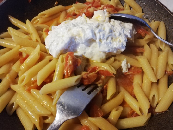 Pasta with burrata is a simple and very tasty dish with Mediterranean flavors! Made with pasta of your choice, seasoned and creamed with a sauce of fresh tomatoes to which is added the inside of the burrata: mozzarella scraps mixed with fresh cream that give a unique fresh taste.