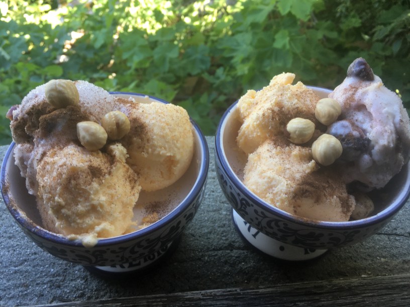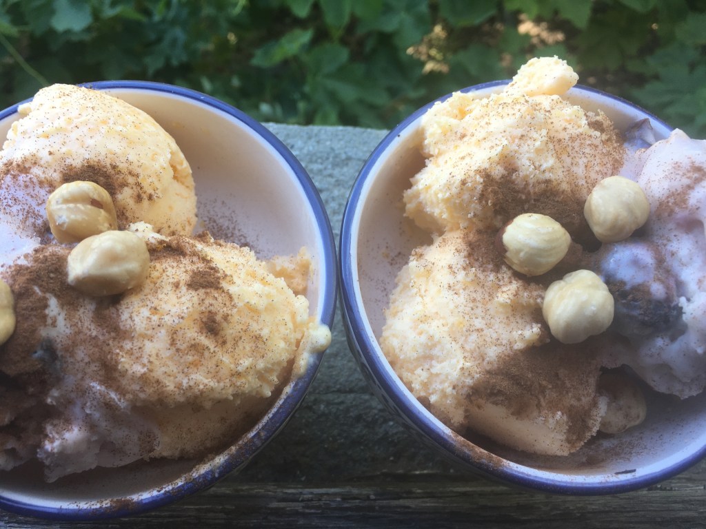 The papaya gelato we’re serving today is next to a Amarena gelato ,a little bit of cinnamon on top and hazelnuts.Try, small variations and a great final taste !