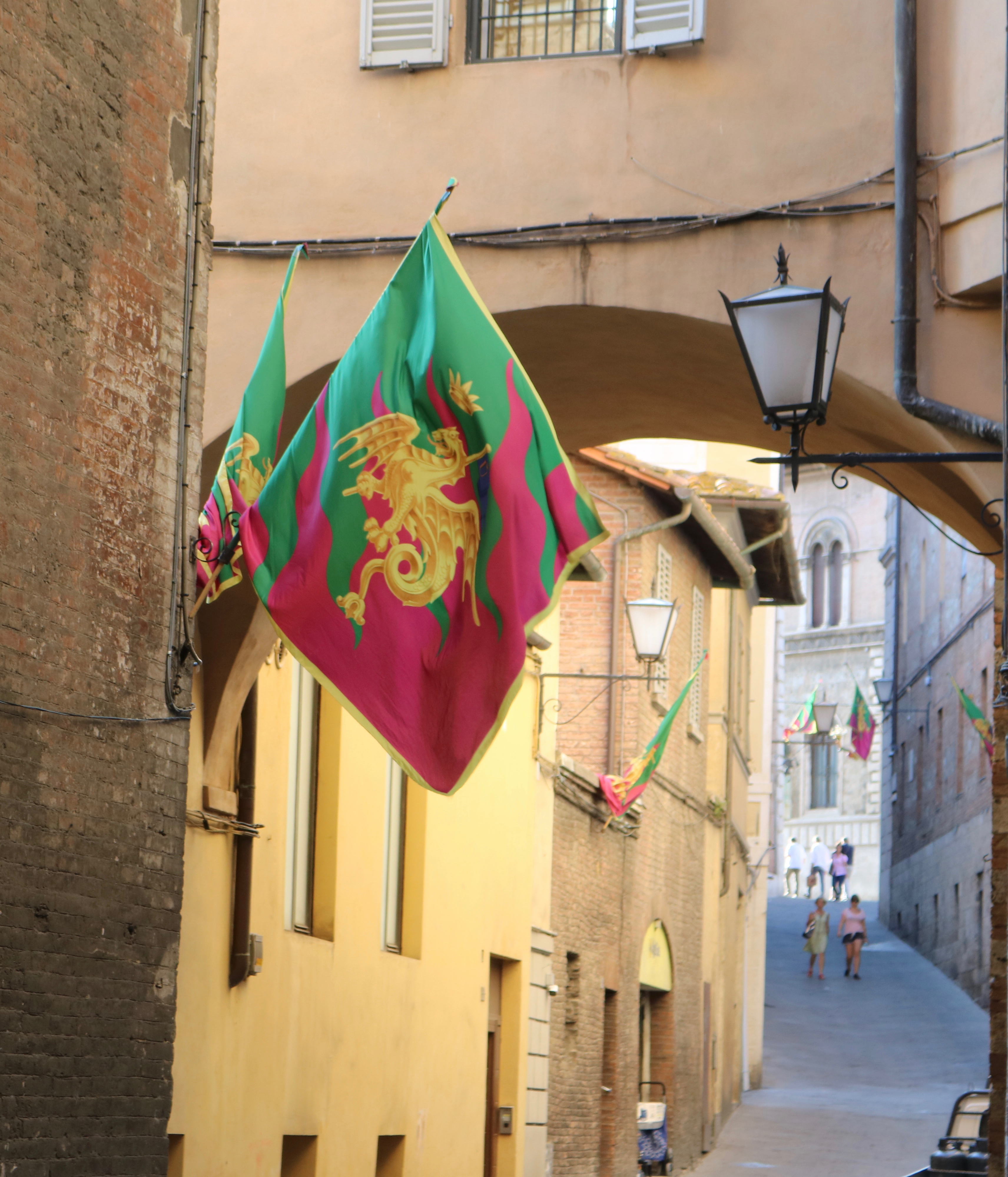 You will see the flags of the different Contradas (districts in which the city is divided), the places to play with the barberi, corners of the city where the symbols of the same Contradas always appear.