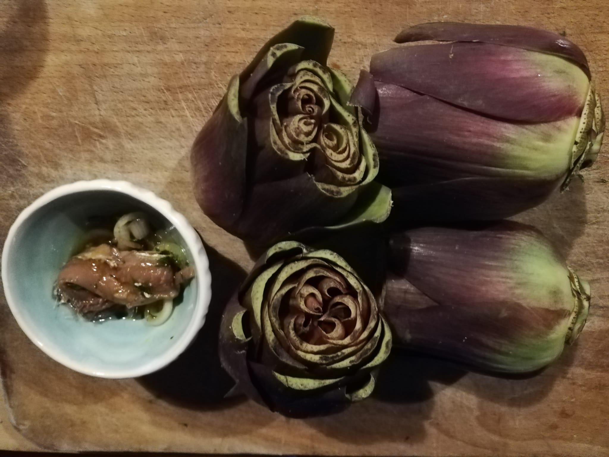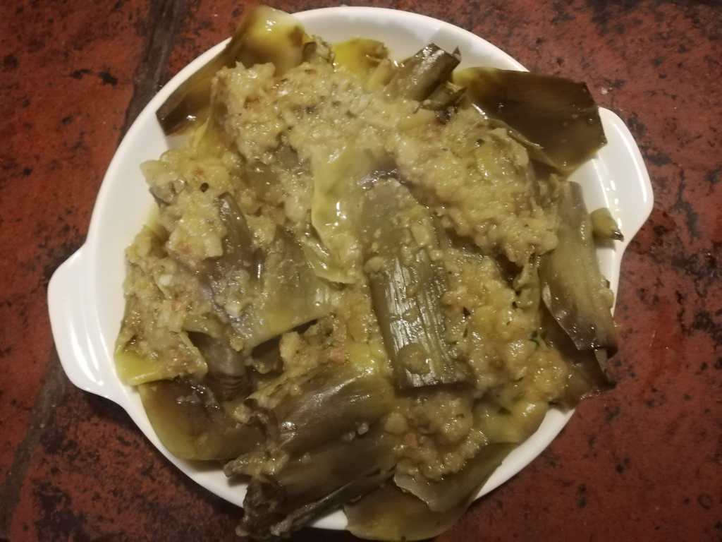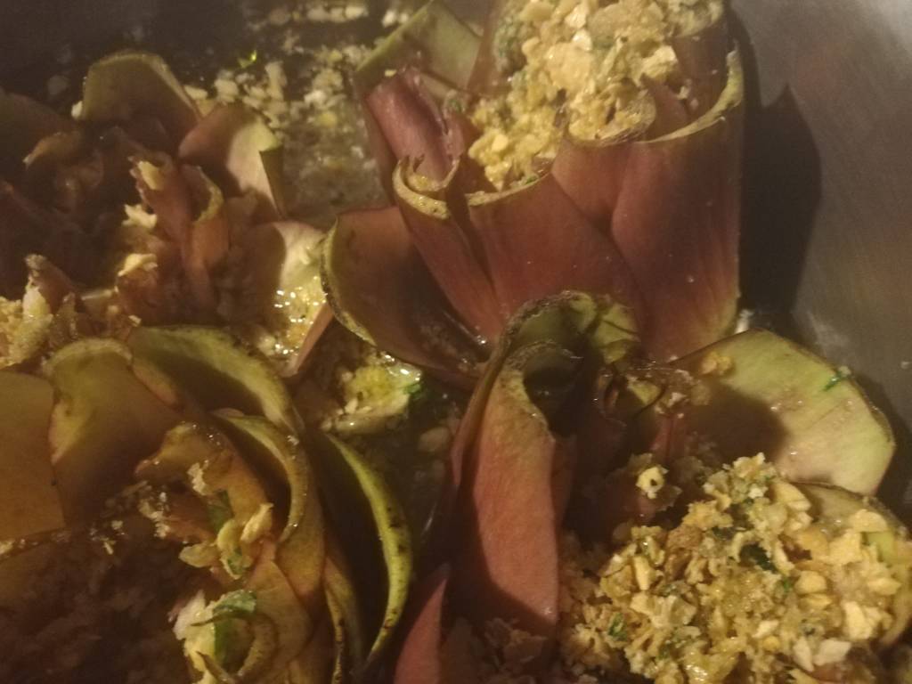 This is the perfect season for artichokes(carciofi in Italian) and when we buy relative small ones usually it’s for a sauce or a pinzimonio.But if we have some extra time to prepare them we can stuff them and there are many stuffing, this is a light one.