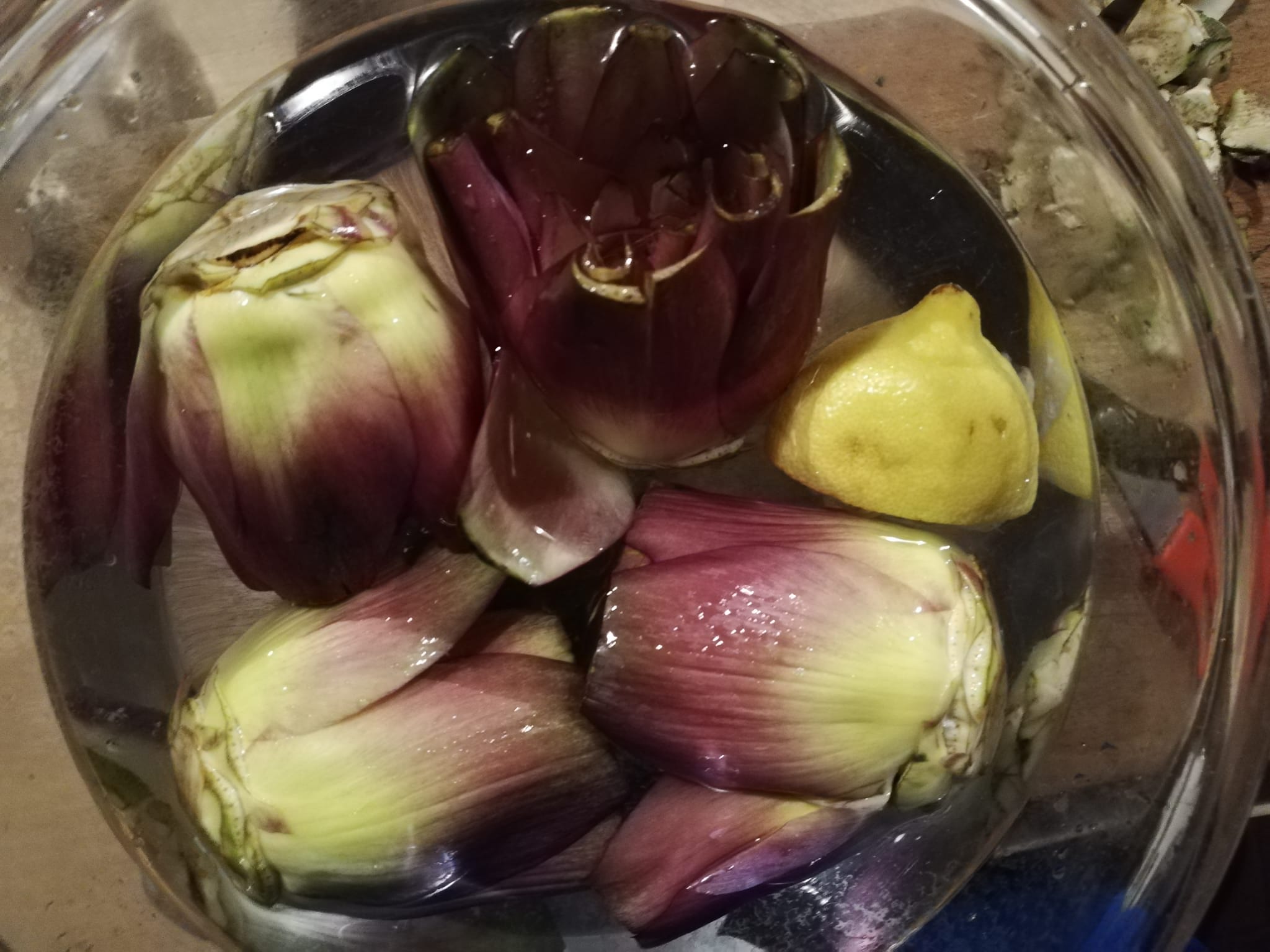 Peel the artichokes, remove the hardest leaves and any internal hay, keep them soaked in water acidulated with lemon juice to prevent them from blackening.